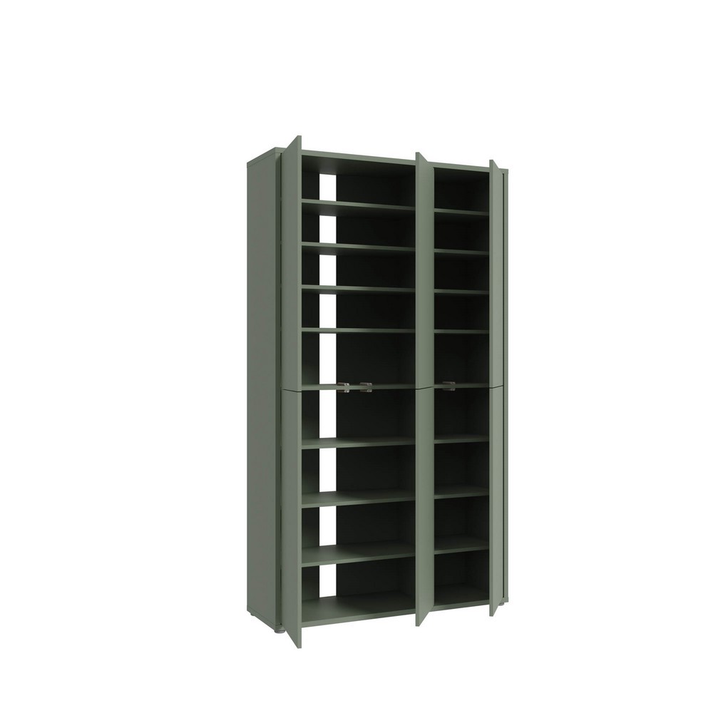 Die stilvolle Farbe Salbei verleiht dem Schrank eine frische, trendige Optik, die sich harmonisch in verschiedene Wohnstile einfügt. Dank der grifflosen Front mit Push-to-Open-Funktion lassen sich die Türen mühelos öffnen und schließen, wodurch ein minimalistisches und elegantes Erscheinungsbild entsteht.