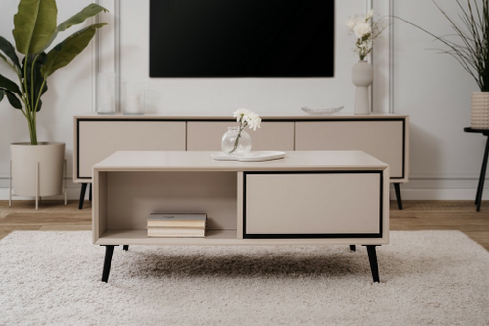 Der Korpusrahmen mit Schrägkante und einer Korpusstärke von ca. 18 mm verleiht dem Couchtisch Stabilität und eine hochwertige Optik. Das Design wird durch die grifflosen Fronten mit Schrägkante abgerundet.