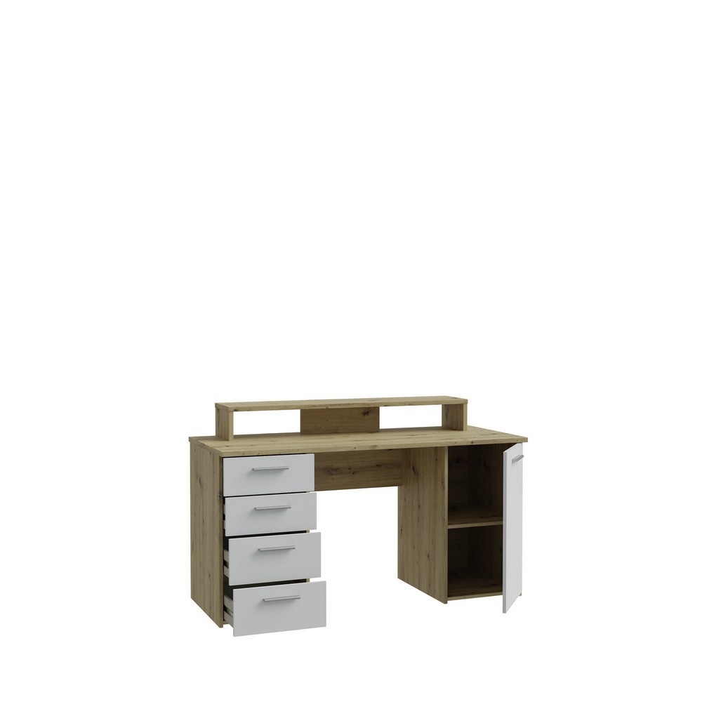 Ausgestattet mit vier geräumigen Schubkästen und einer Tür, bietet der Schreibtisch Balu jede Menge Stauraum für Unterlagen, Büromaterial oder persönliche Gegenstände – alles ordentlich verstaut und schnell griffbereit.