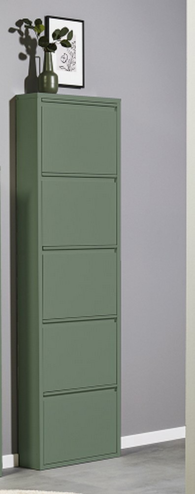 Der Schuhkipper Barnebas überzeugt durch sein modernes Design und seine besonders platzsparende Bauweise. In stilvollem Salbei lackiertem Metall gestaltet, setzt er einen frischen Akzent im Eingangsbereich und sorgt für eine ordentliche Atmosphäre.