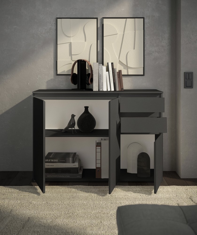 Die Kommode Benedetta 3 verbindet modernes Design mit praktischer Funktionalität und bietet vielseitigen Stauraum für dein Zuhause. Mit ihren Maßen von ca. 119 x 84 x 35 cm (B/H/T) passt sie ideal in Wohn-, Schlaf- oder Eingangsbereiche. Die Front und der Korpus in Anthrazit bestehen aus robuster Spanplatte mit Melaminharzbeschichtung, die pflegeleicht und widerstandsfähig ist.