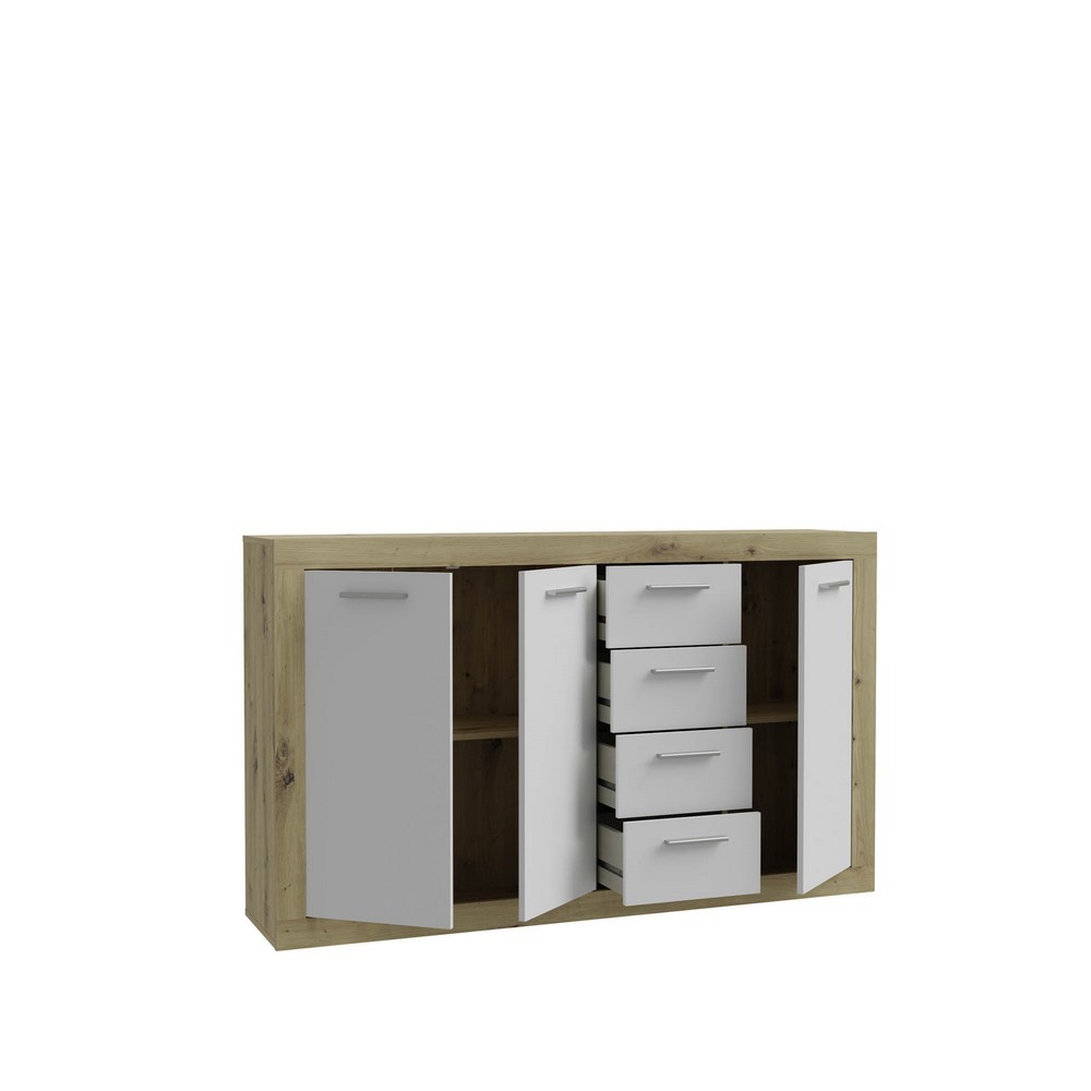 Das Sideboard Benjamen überzeugt mit seinem modernen Design und praktischer Funktionalität. Die Front in Weiß sorgt für eine helle und elegante Optik, während der Korpus in Artisan Eiche Nachbildung eine warme, natürliche Ausstrahlung verleiht.
