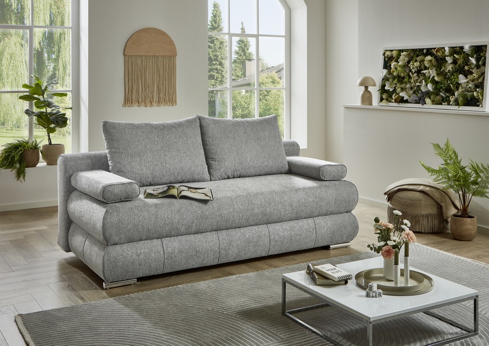 Dank der Schlaffunktion und des integrierten Bettkastens ist das Sofa auch ideal für Gäste. Die Sitzfläche ist vorziehbar, die Rückenlehne klappbar, sodass im Handumdrehen eine Liegefläche von ca. 138x195 cm entsteht. Für zusätzlichen Komfort sorgen zwei große Rückenkissen (ca. 73x50x20 cm) und zwei Armlehnkissen (ca. 68x25x11 cm). Das Sofa steht auf modernen Edelstahlfüßen vorn sowie schwarzen Kunststoff-Stützfüßen hinten für sicheren Halt.