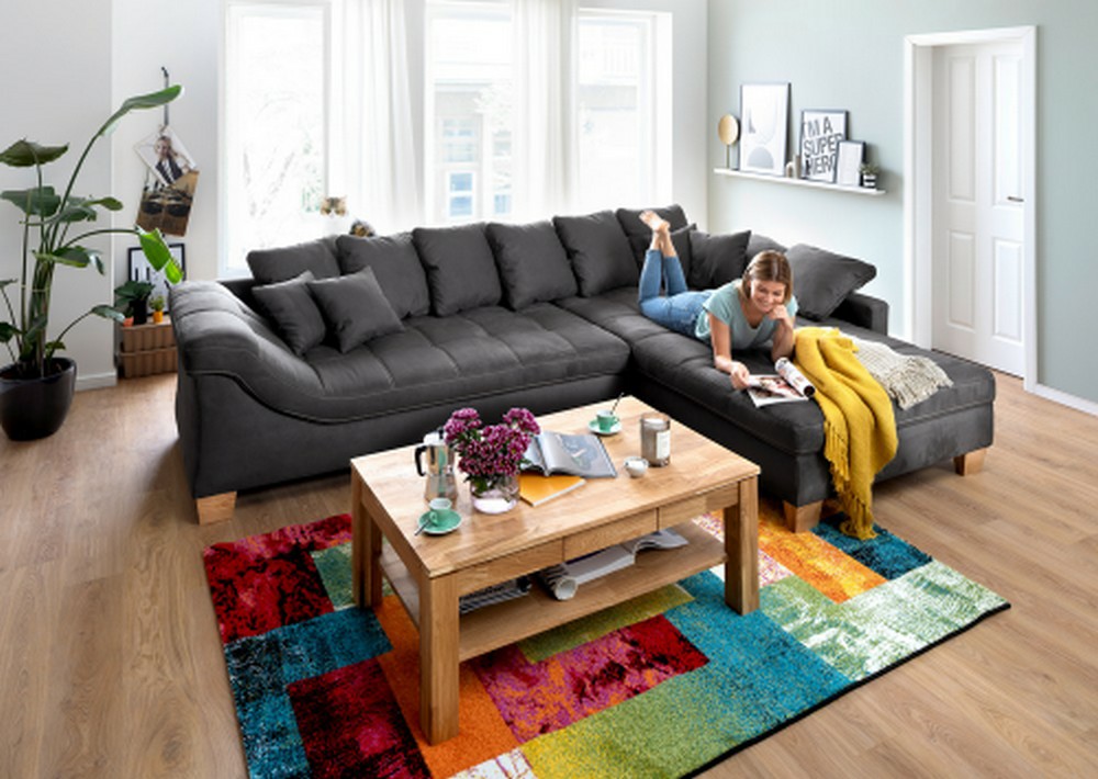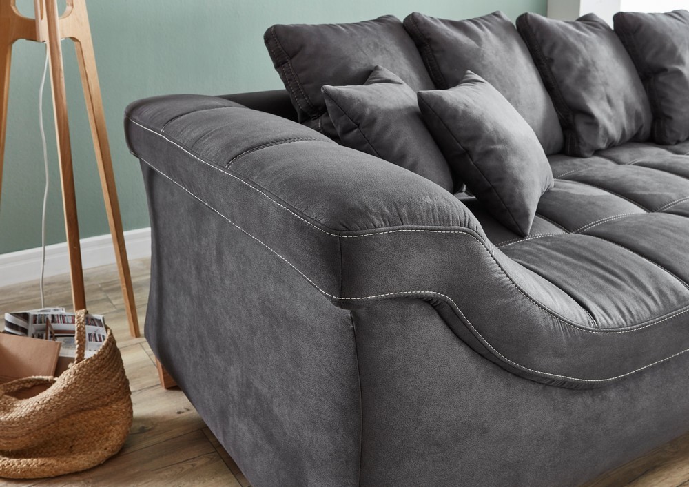 Zum Lieferumfang gehören sechs große Rückenkissen und vier Zierkissen im passenden Bezugsstoff, die für zusätzlichen Komfort sorgen. Der echt bezogene Rücken ermöglicht eine flexible Platzierung im Raum. Zudem ist das Sofa einmalig seitenverkehrt montierbar, sodass es sich perfekt an die Raumgegebenheiten anpassen lässt.