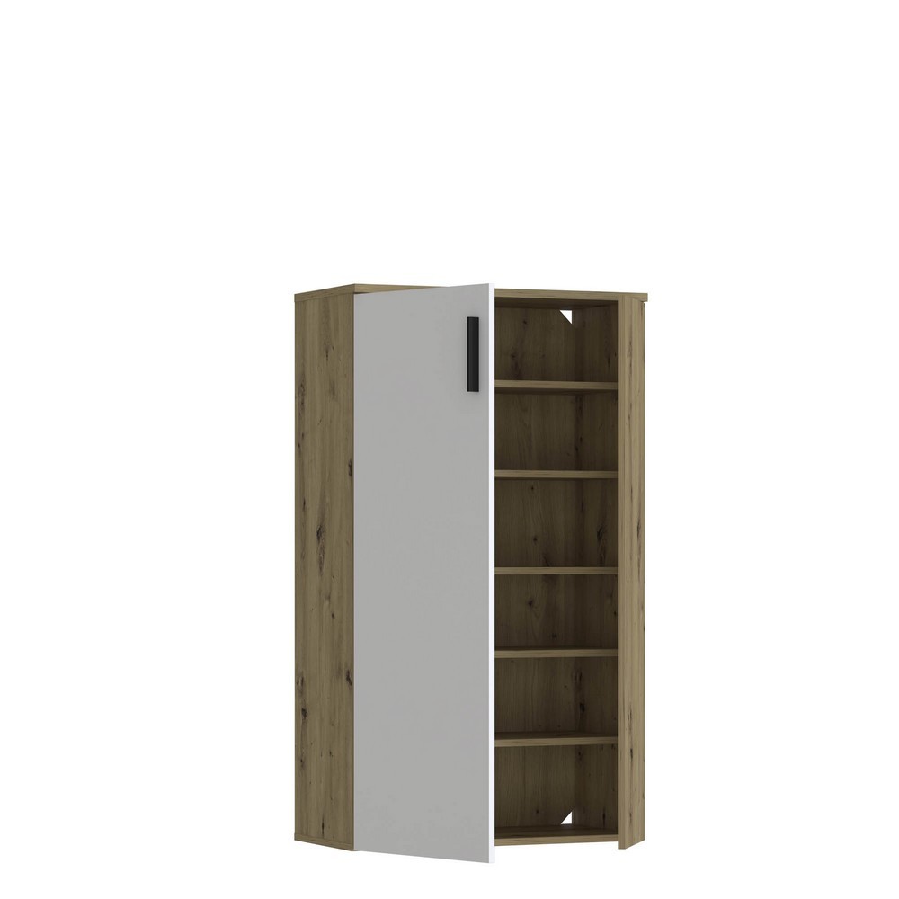 Die Farbkombination aus Artisan Eiche Nachbildung und Weiß sorgt für eine zeitlose und elegante Optik, die sich in verschiedene Einrichtungsstile integriert. Der schwarze Griff setzt einen modernen Akzent und rundet das schlichte, aber stilvolle Design ab.