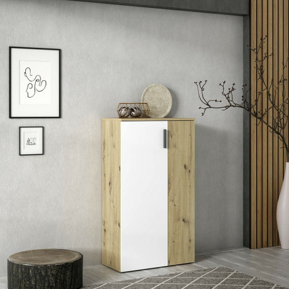 Dank der zwei Türen bietet der Schuhschrank praktischen Stauraum für Schuhe oder andere kleine Alltagsgegenstände und sorgt für ein aufgeräumtes Ambiente.