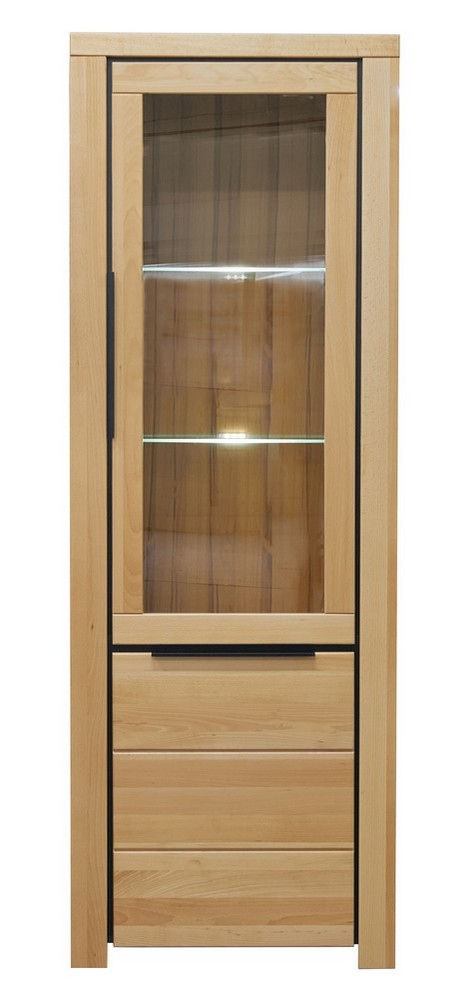 Die Front aus massiver Buche verleiht der Vitrine eine natürliche, warme Ausstrahlung, während der Korpus in Buche Nachbildung das harmonische Gesamtbild abrundet.