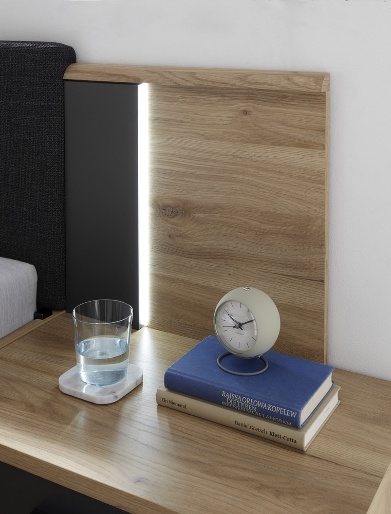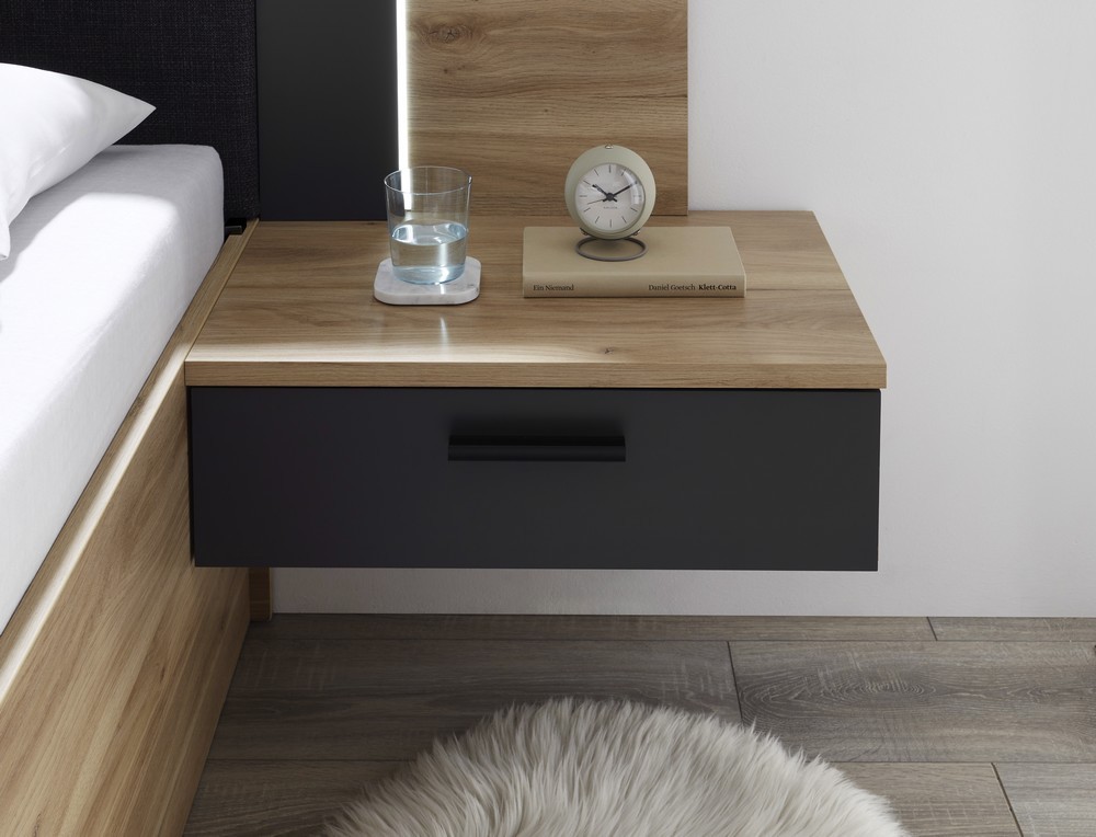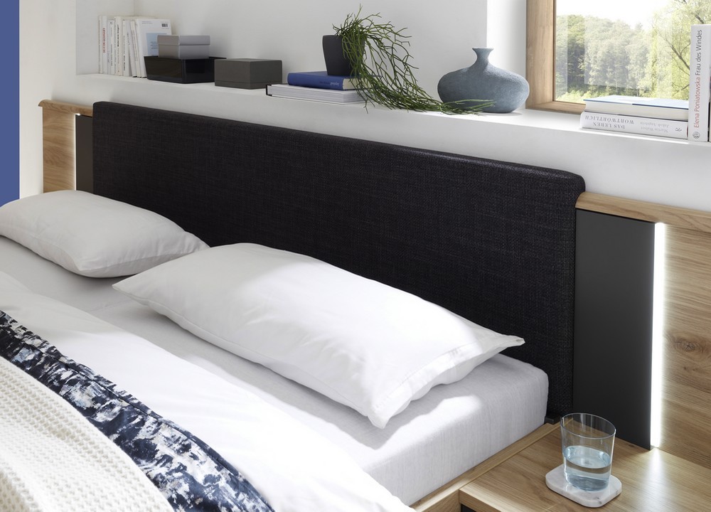 Die elegante Bettanlage Bruno-Amalia in den Maßen ca. 305 x 93 x 210 cm (B/H/T) kombiniert stilvolles Design mit durchdachter Funktionalität. In der warmen Holzoptik Mauvella Oak mit hochwertiger Dekorfolie und Spiegelelementen fügt sich das Bett harmonisch in jedes Schlafzimmer ein. Die großzügige Liegefläche von 180 x 200 cm bietet viel Platz für erholsame Nächte. Das gemütlich gepolsterte Kopfteil in einem edlen Graphit Webstoff lädt zum Anlehnen ein. Für zusätzlichen Komfort sorgt das beleuchtete Kopfteilpaneel (Energieeffizienzklasse G), das eine angenehme Atmosphäre schafft.