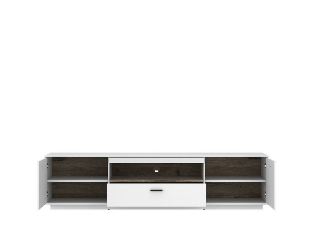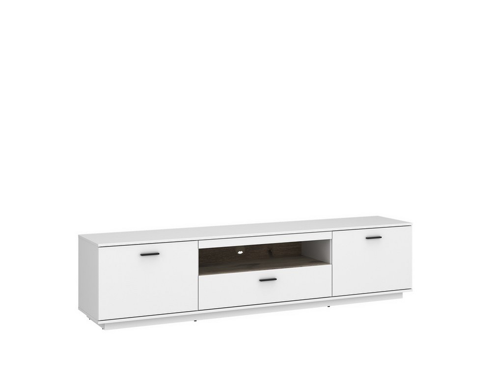 Mit großzügigen Maßen von ca. 210 x 52 x 50 cm (B/H/T) bietet das Lowboard ausreichend Platz für Ihren Fernseher sowie zusätzliche Mediengeräte. Hinter den zwei Türen verbirgt sich praktischer Stauraum für Zubehör, während der Schubkasten weiteren Platz für Fernbedienungen, Kabel oder Dokumente schafft.