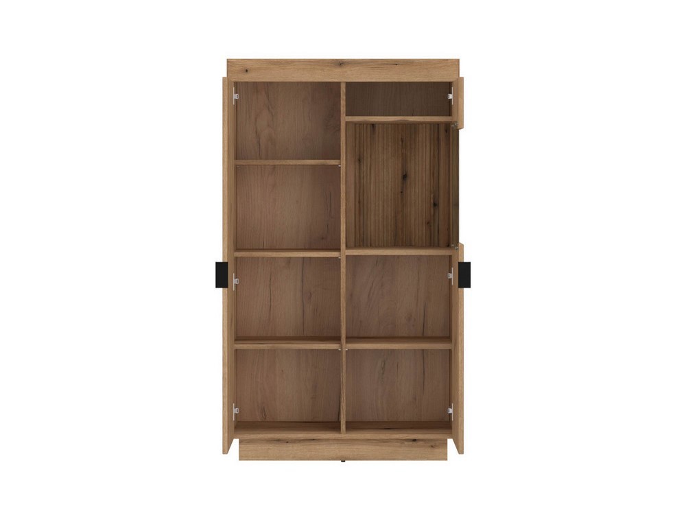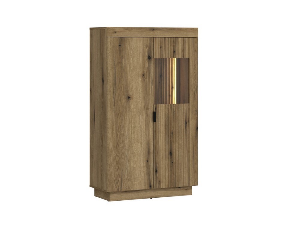 Die Front und der Korpus in PVC Eiche Coast Evoke Nachbildung verleihen der Vitrine eine warme, natürliche Optik. Die Metallgriffe sorgen für einen modernen Look, während die Kunststoffgleiter einen stabilen Stand garantieren. Dank der Softclose-Funktion schließen die zwei Türen besonders sanft und geräuschlos.