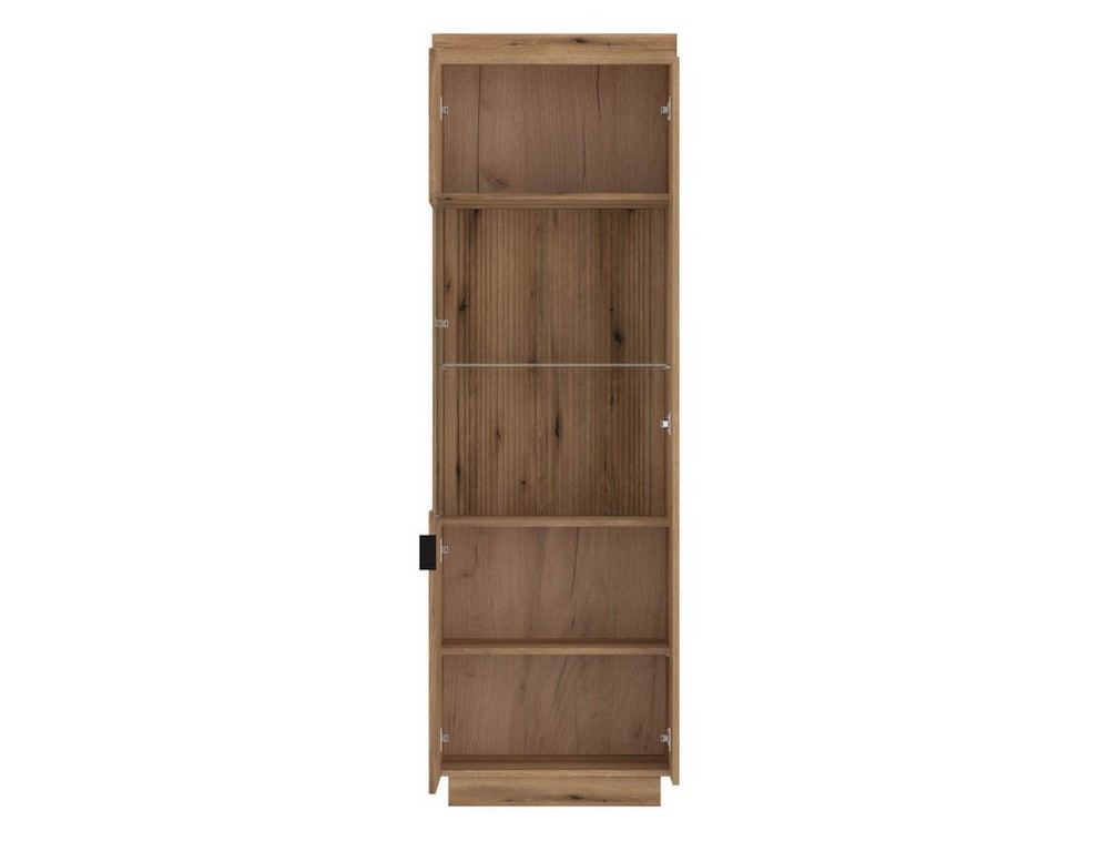 Die Vitrine Dallas kombiniert modernes Design mit funktionalen Details und schafft eine stilvolle Atmosphäre in deinem Wohnraum. Mit ihren Maßen von ca. 63x198x40 cm (B/H/T) bietet sie ausreichend Platz für dekorative Elemente und Alltagsgegenstände.