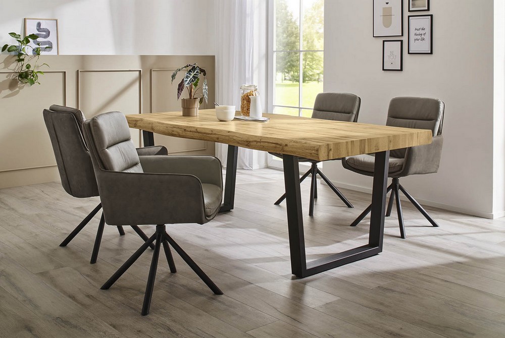 Besonders eindrucksvoll ist die extra dicke Plattenstärke von 8 cm, die dem Tisch eine kraftvolle Präsenz verleiht. Das schwarze U-Gestell aus Metall bildet einen stilvollen Kontrast zur warmen Holzoptik und sorgt für Stabilität sowie eine moderne, industrielle Note. Der Daria 1 Tisch ist ein echtes Statement-Möbel für Esszimmer und Wohnküche.