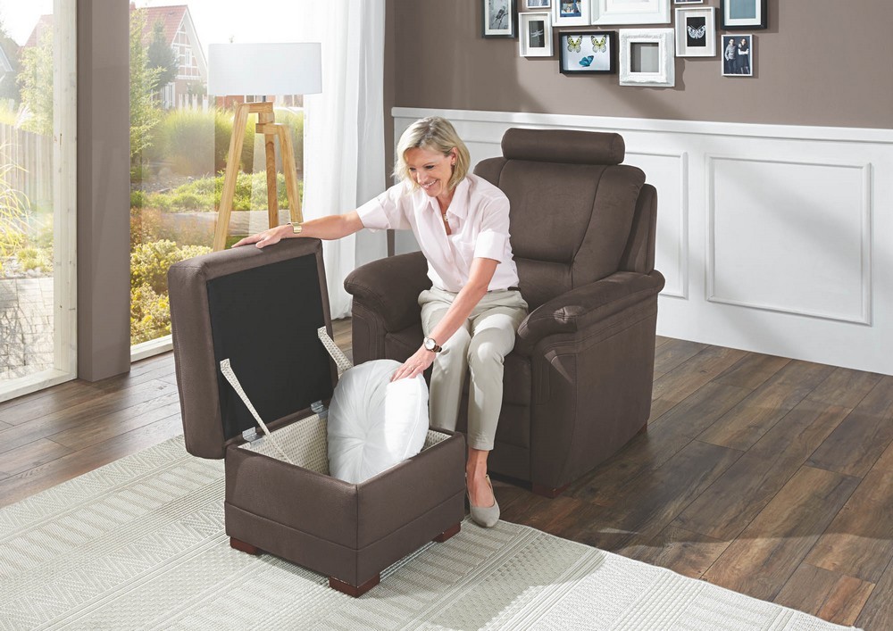 Besonders praktisch: Der Hocker verfügt über eine Klappe, die zusätzlichen Stauraum bietet – ideal für Kissen, Decken oder andere kleine Utensilien.
