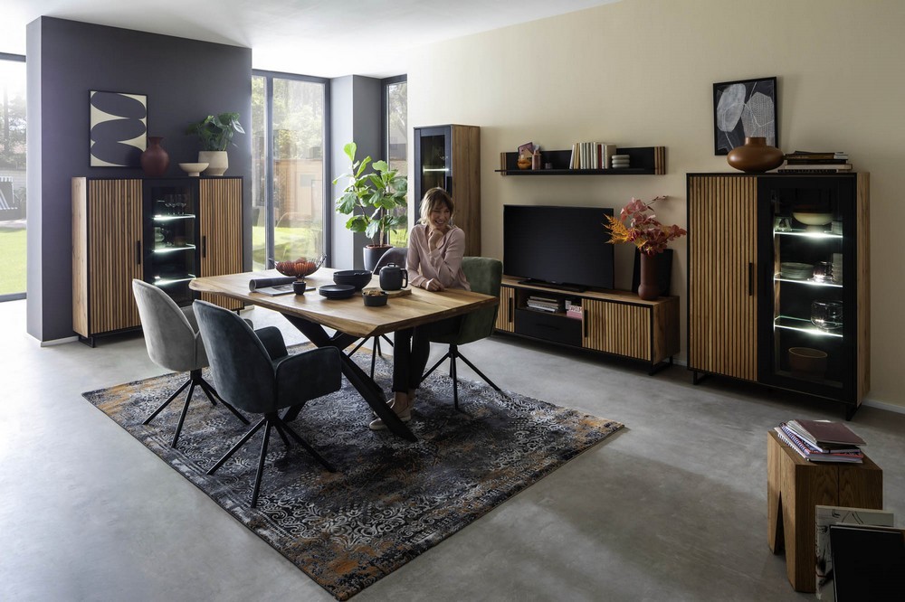 Der Korpus und die Rückwand in Eiche Nachbildung harmonieren ideal mit den hochwertigen teilmassiven Fronten in Eiche, wodurch ein warmer, wohnlicher Charakter entsteht. Stilvolle Absetzungen in Schwarz mit Akustikpaneel setzen einen modernen Kontrast und verleihen dem Möbelstück eine besondere optische Tiefe.
