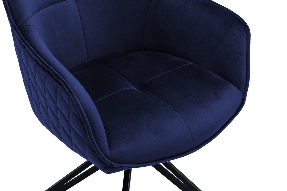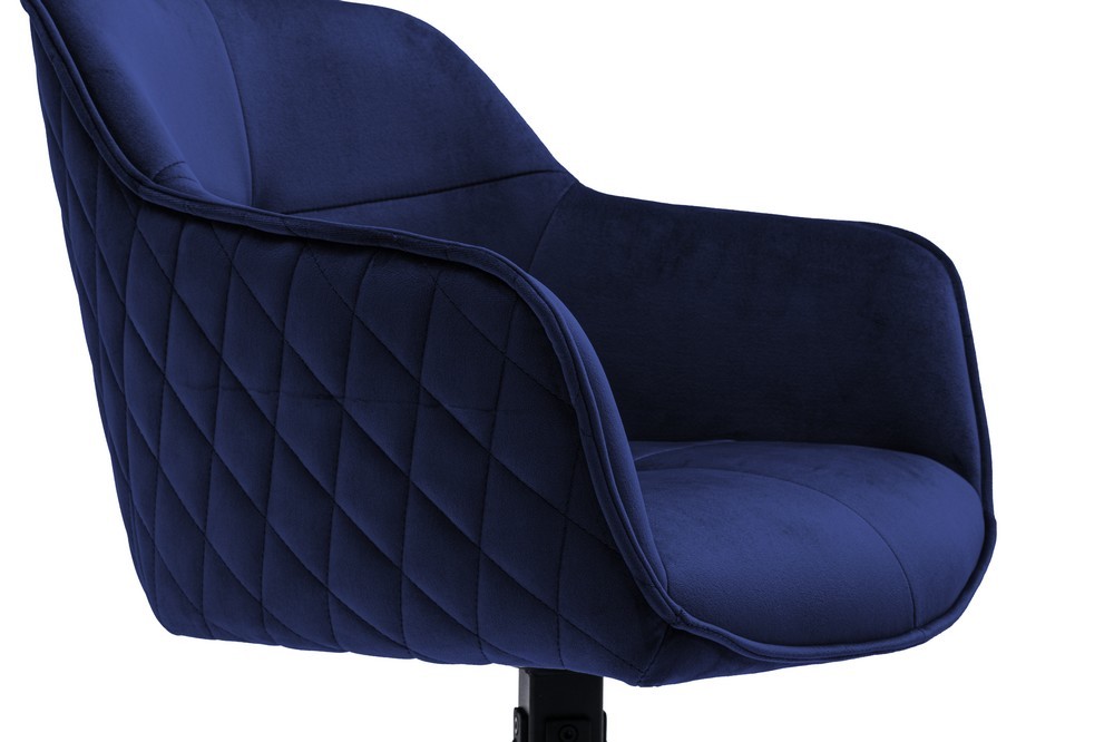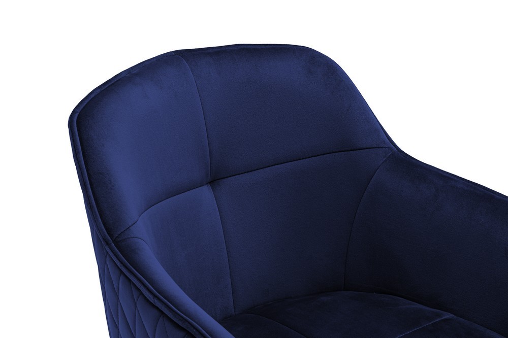Der edle Samtbezug in Blau (100 % Polyester) verleiht dem Stuhl eine luxuriöse Note, während die markante Diamant-Steppung an der Außenseite für einen stilvollen Akzent sorgt.