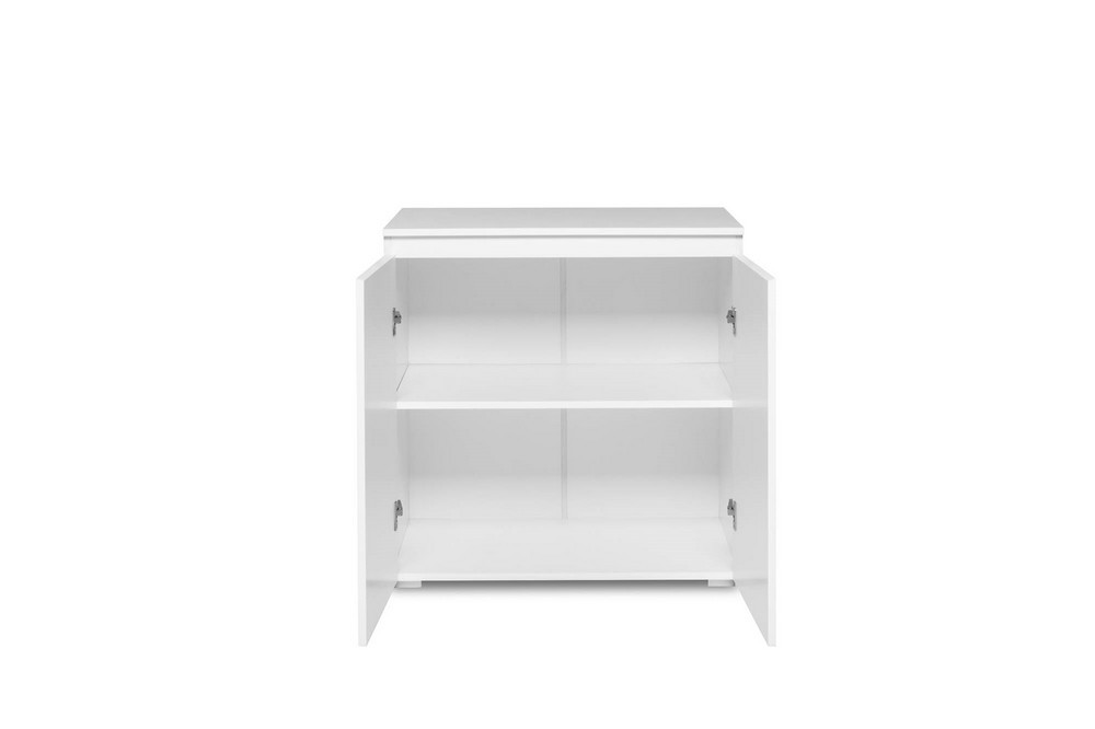 Die weiße Optik sorgt für eine helle und frische Atmosphäre, während der grifflosen Design mit Schrägkante und Melaminbeschichtung für eine moderne, pflegeleichte Oberfläche sorgt. Die Metalloptik-Füße fügen sich stilvoll in das Gesamtbild ein. Mit zwei Türen und einer Einlegeplatte bietet die Kommode praktischen Stauraum für alles, was du ordentlich verstauen möchtest.