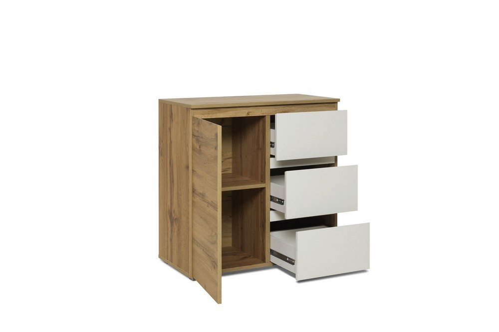 Der Korpus in Honig Eiche und die weiße Front sorgen für eine warme, einladende Optik, während die grifflosen Türen und die Schrägkante mit Melaminbeschichtung eine moderne, pflegeleichte Oberfläche bieten. Die Metalloptik-Füße fügen sich elegant in das Gesamtbild ein. Die Kommode verfügt über eine Tür, drei Schubkästen und eine Einlegeplatte, die eine praktische und übersichtliche Aufbewahrung deiner Gegenstände ermöglichen.