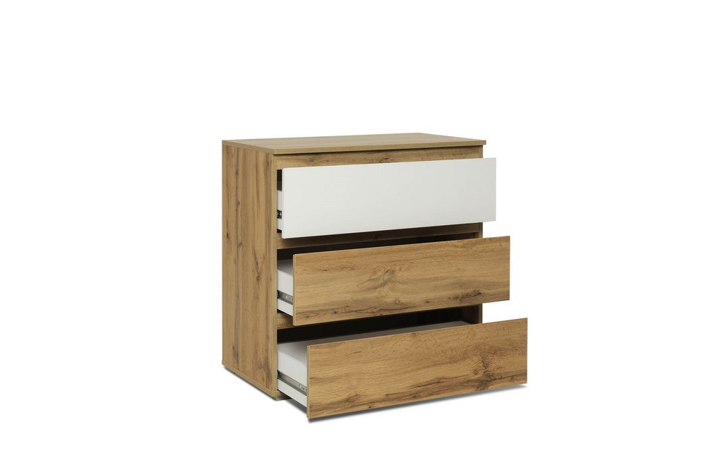 Die Kombination aus Honig Eiche und Weiß sorgt für eine warme und zugleich moderne Atmosphäre. Die grifflosen Türen und die Schrägkante mit Melaminbeschichtung machen sie pflegeleicht und zeitgemäß. Die Metalloptik-Füße ergänzen das moderne Design. Mit drei Schubkästen bietet die Kommode genügend Platz, um deine Sachen ordentlich und übersichtlich zu verstauen.
