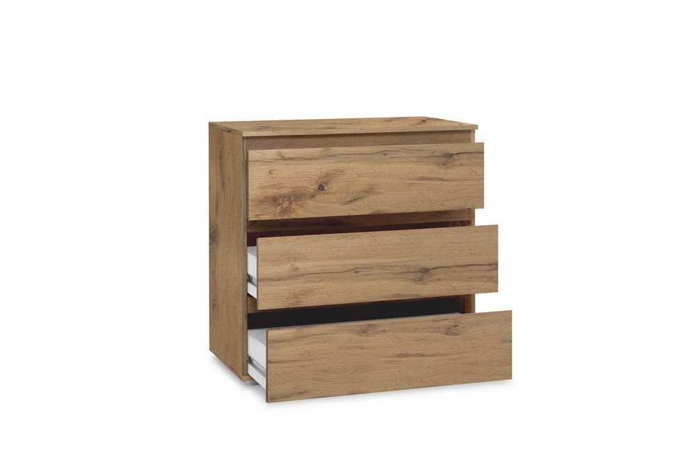 Die Honig Eiche sorgt für eine warme, natürliche Ausstrahlung, während die grifflosen Türen und die Schrägkante mit Melaminbeschichtung eine moderne und pflegeleichte Oberfläche bieten. Die Metalloptik-Füße fügen sich hervorragend in das zeitgemäße Design ein. Mit drei Schubkästen bietet diese Kommode ausreichend Platz für deine Sachen.