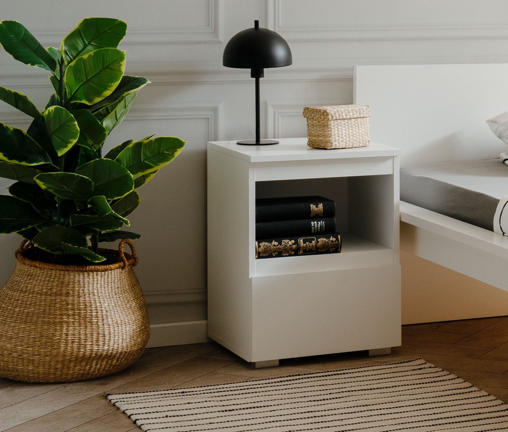 Mit 1 offenem Fach und 1 Schubkasten auf Kugelauszug bietet der Nachtschrank Platz für Bücher, Brille, Wecker und mehr. Die Füße in Metalloptik verleihen ihm eine moderne, leichte Anmutung.