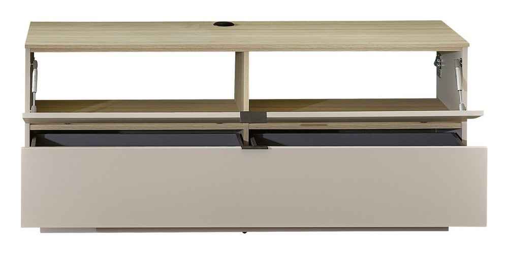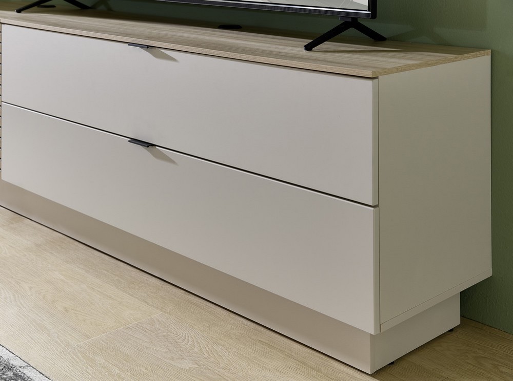Die edle Oberfläche in MDF Kaschmir wird durch stilvolle Absetzungen in MDF Riva Eiche Nachbildung ergänzt. Softclose und Selbsteinzug sorgen für komfortables, leises Schließen von 1 Klappe und 1 Schubkasten.