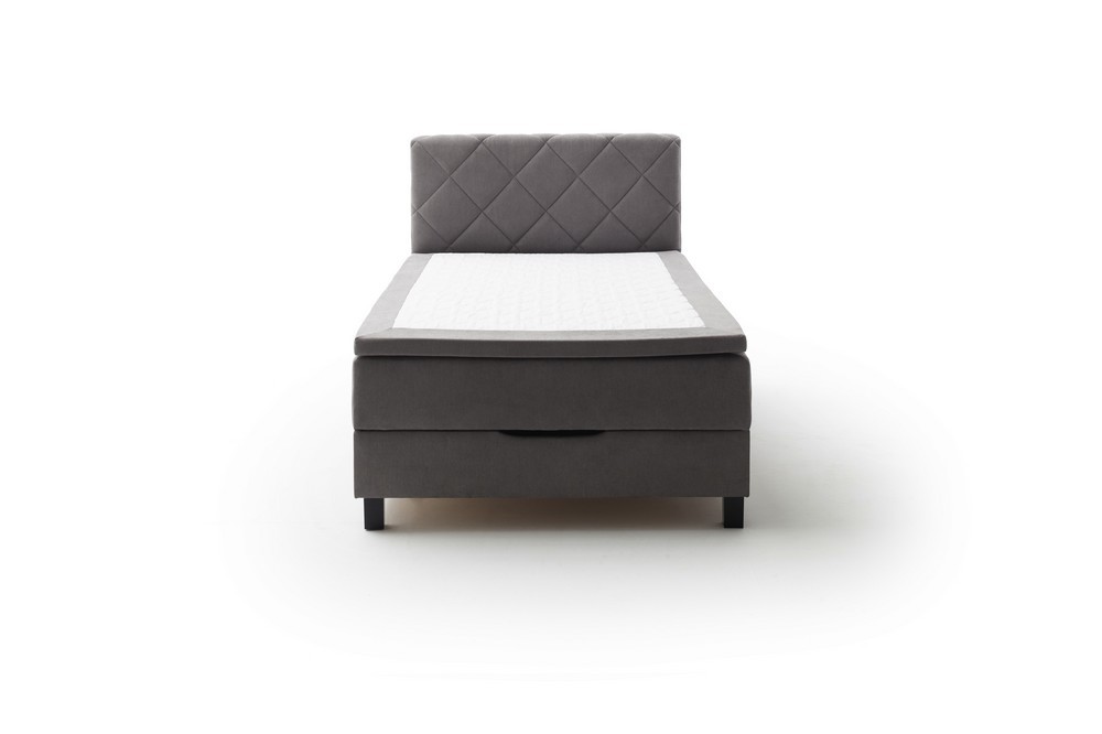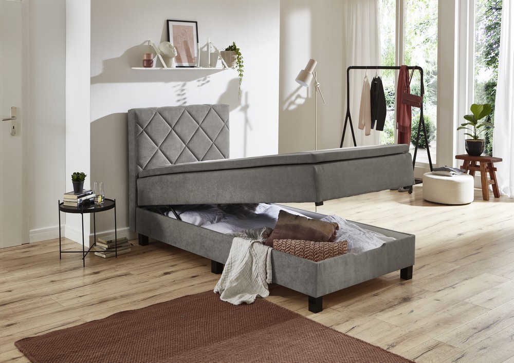 Die Basisbox mit integriertem Bettkasten bietet praktischen Stauraum, während der Bonellfederkern mit 120 Federn/m² für angenehmen Schlafkomfort sorgt.