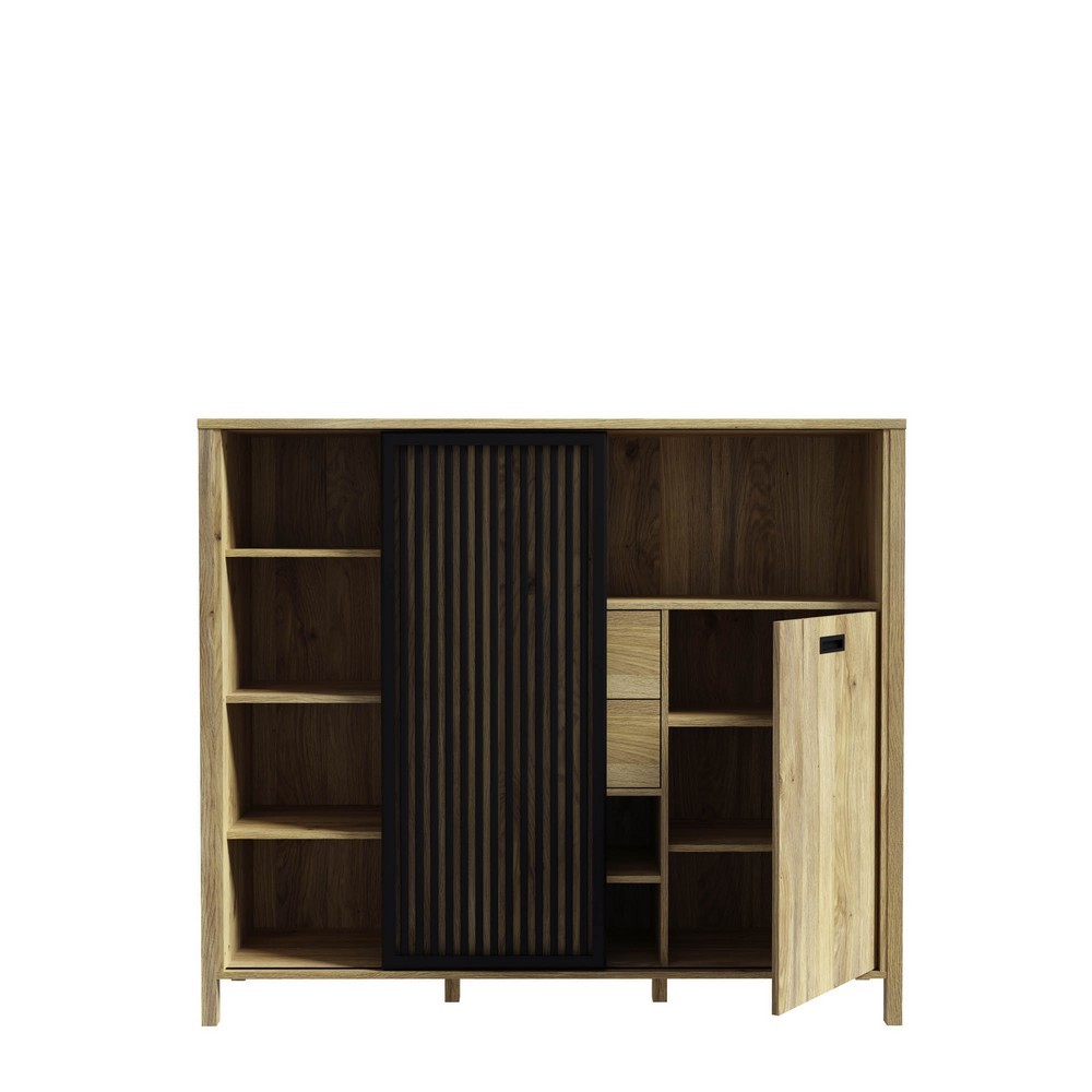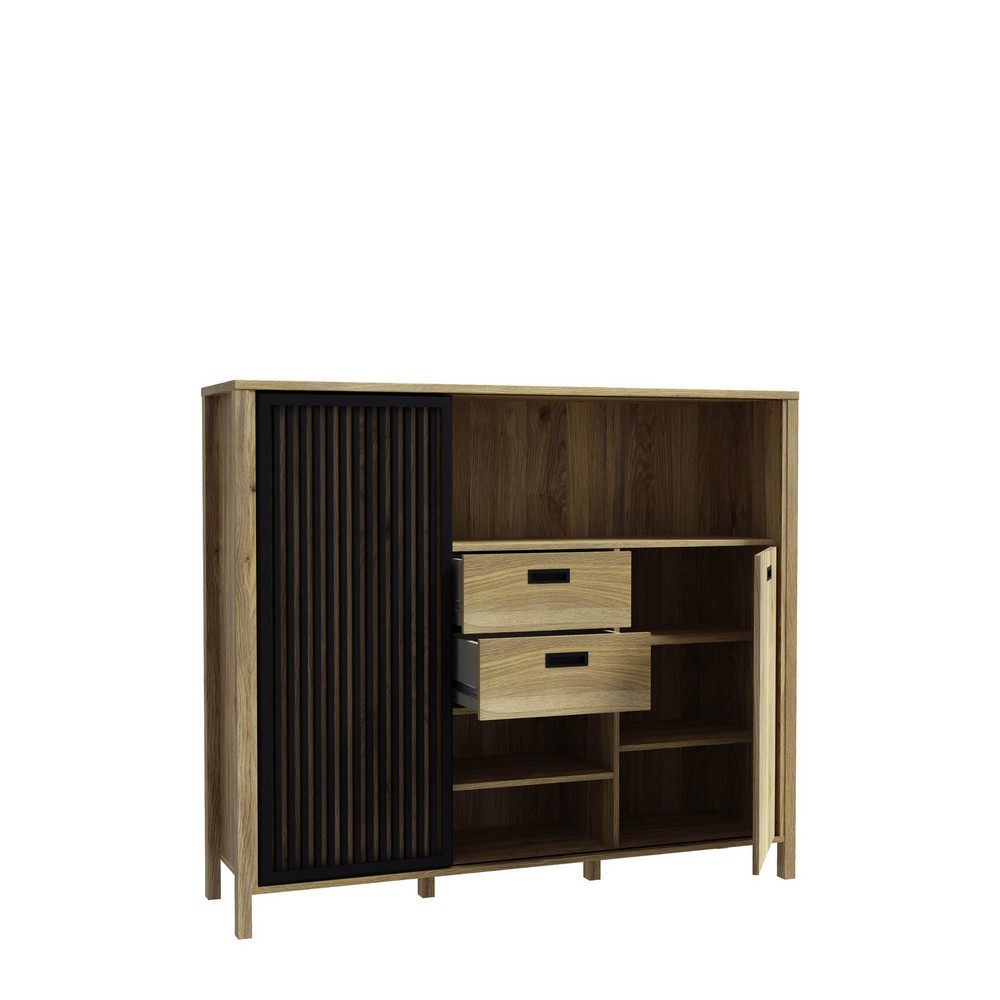 Dank zwei Türen und zwei Schubkästen bietet das Highboard vielseitige Aufbewahrungsmöglichkeiten – perfekt für geschlossene und offene Lagerung.