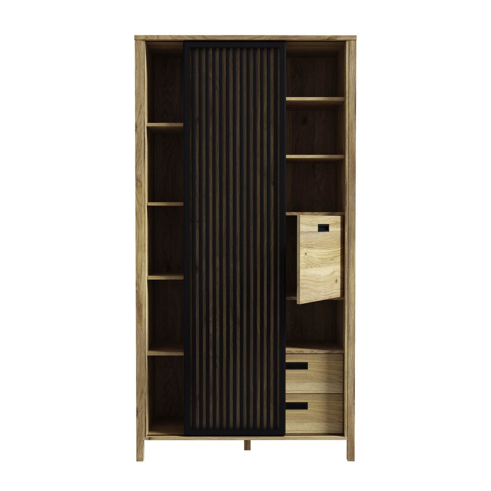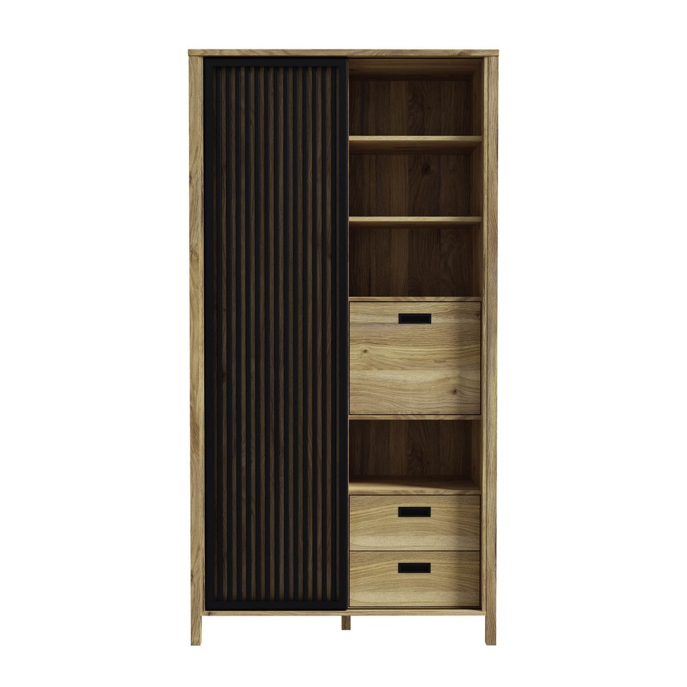 Mit zwei Türen und zwei Schubkästen bietet das Highboard vielseitige Aufbewahrungsmöglichkeiten – ideal für geschlossene und offene Lagerung.