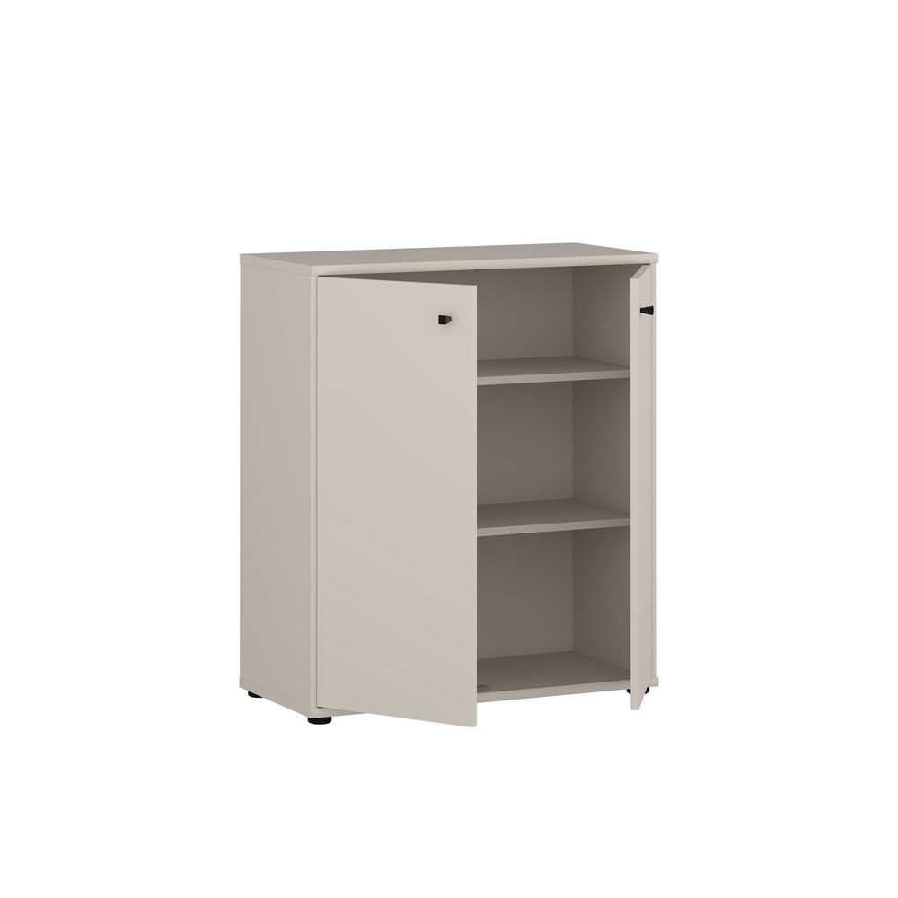 Hinter den zwei Türen verbirgt sich praktischer Stauraum für Alltagsgegenstände, Textilien oder Haushaltszubehör. Die schwarzen Kunststoffgriffe setzen einen stilvollen Akzent und sorgen für ein modernes Gesamtbild.