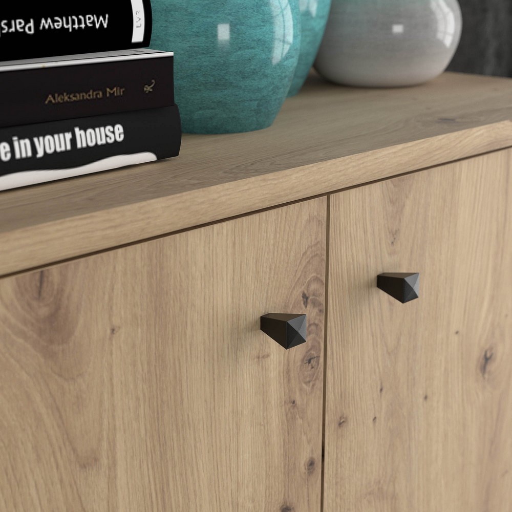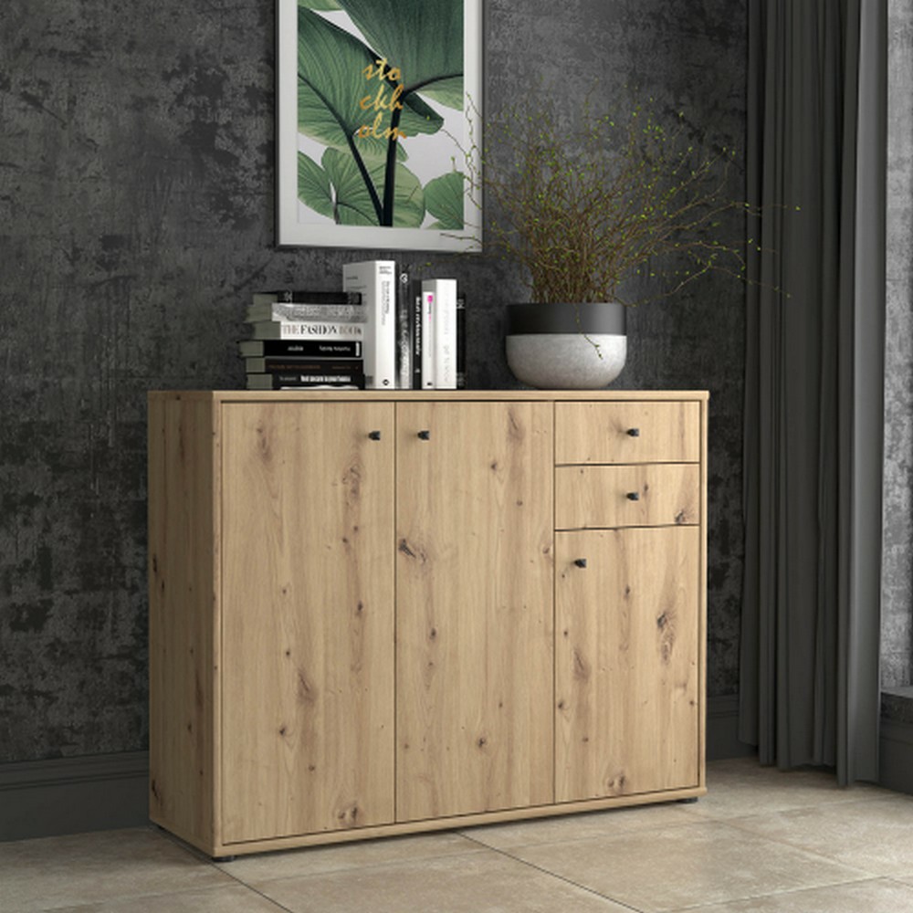 Die Kommode June 2 in Artisan Eiche Nachbildung vereint modernes Design mit praktischer Funktionalität. Die warme Holzoptik schafft eine gemütliche Atmosphäre, während die schwarzen Griffe für einen stilvollen Kontrast sorgen. Mit drei Türen und zwei Schubkästen bietet sie viel Stauraum für deine persönlichen Gegenstände und sorgt für Ordnung in Wohn-, Schlaf- oder Flurbereich. Dank der Maße von ca. 109 x 86 x 35 cm (B/H/T) passt sie perfekt in verschiedene Wohnräume und lässt sich vielseitig kombinieren.