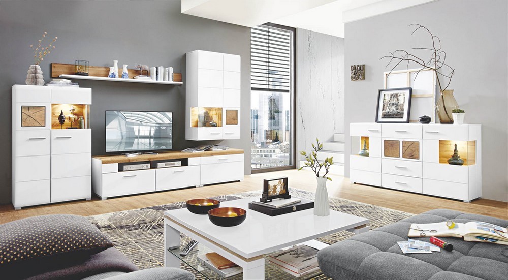Die Farbkombination aus Weiß matt und Hirnholz Nachbildung verleiht der Vitrine eine zeitlose und edle Optik, während die verchromten Metallgriffe für einen modernen Akzent sorgen. Ein besonderes Highlight ist die integrierte LED-Beleuchtung in warmweiß, die für eine angenehme und gemütliche Ausstrahlung sorgt.