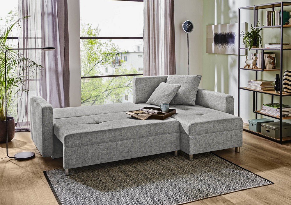 Ein integrierter Bettkasten bietet zusätzlichen Stauraum für Decken oder Kissen. Der echt bezogene Rücken ermöglicht eine flexible Platzierung der Wohnlandschaft im Raum.