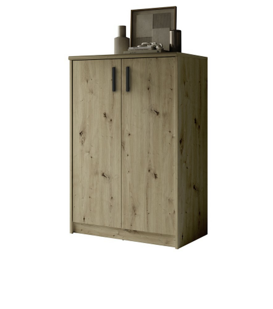 Ausgestattet mit 2 Türen und 2 Einlegeböden, bietet die Kommode viel Platz für Bücher, Geschirr oder andere Gegenstände. Der moderne schwarze Stangengriff aus Kunststoff rundet das schlichte Design harmonisch ab. Eine vielseitige und elegante Lösung für dein Zuhause!