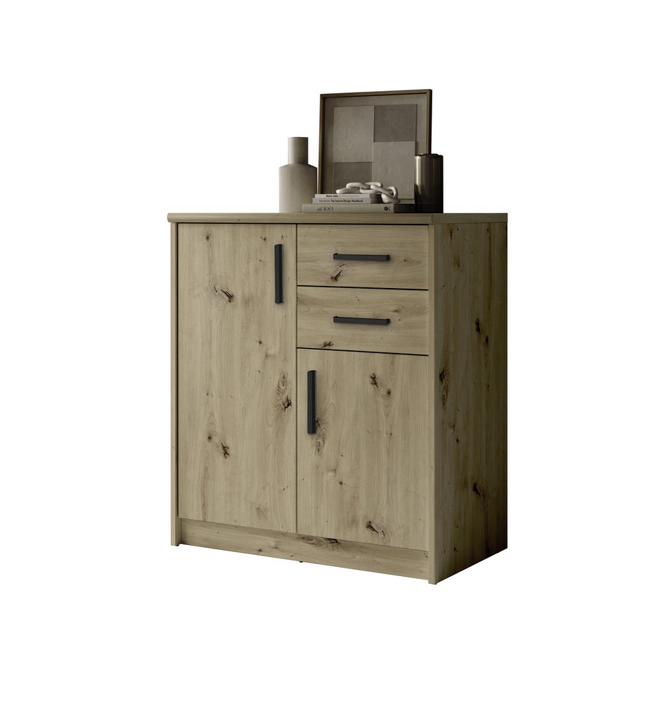 Der Korpus in Artisan Eiche Nachbildung sorgt für eine warme, wohnliche Ausstrahlung, während die schwarzen Kunststoff-Stangengriffe einen modernen Akzent setzen. Hinter zwei Türen verbergen sich drei Einlegeböden für übersichtliche Aufbewahrung, ergänzt durch zwei leichtgängige Schubkästen für kleinere Gegenstände. Die Nefyn Kommode ist eine kompakte, praktische Lösung mit zeitgemäßem Look.