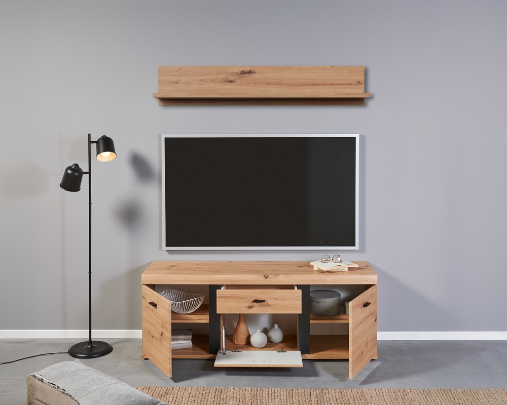 Das passende Wandboard ergänzt das Set perfekt – ideal für Bücher, Deko oder Pflanzen. Die Kombination aus Funktionalität und Design macht es zu einem echten Hingucker über dem TV-Board.