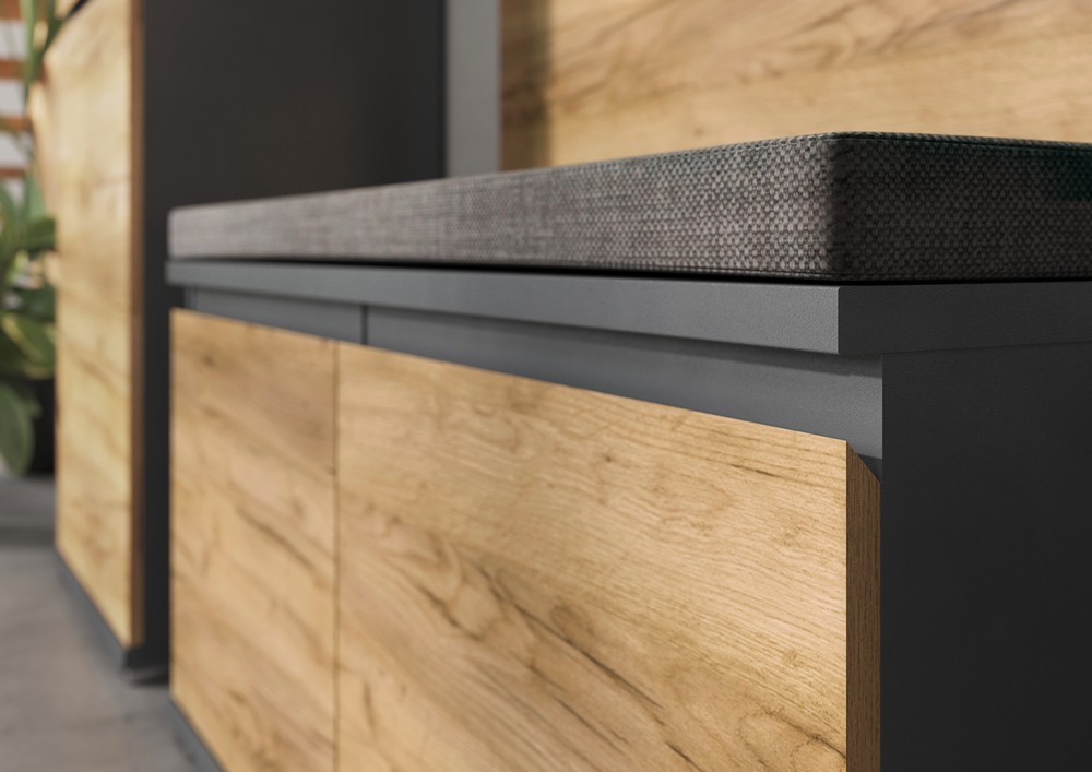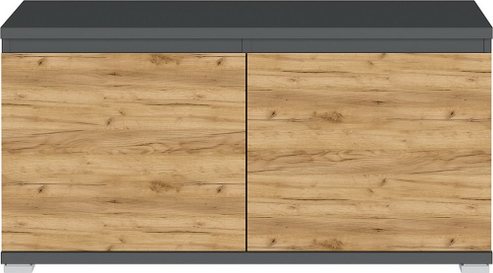Die Linhares Schuhbank überzeugt mit klarer Formensprache und modernem Design. Mit ihren kompakten Maßen von ca. 96 x 52 x 40 cm (B/H/T) bietet sie eine praktische Sitzgelegenheit und gleichzeitig Stauraum für Schuhe oder Accessoires. Die stilvolle Kombination aus Anthrazit und Navarra Eiche Nachbildung verleiht der Bank eine zeitgemäße, wohnliche Optik. Durch das grifflose Design wirkt die Front besonders puristisch und harmonisch. Die Schuhbank wird ohne Kissen geliefert und lässt sich dadurch individuell mit einem passenden Sitzpolster ergänzen. Ideal für Flur, Eingangsbereich oder Ankleide – formschön, funktional und vielseitig einsetzbar.