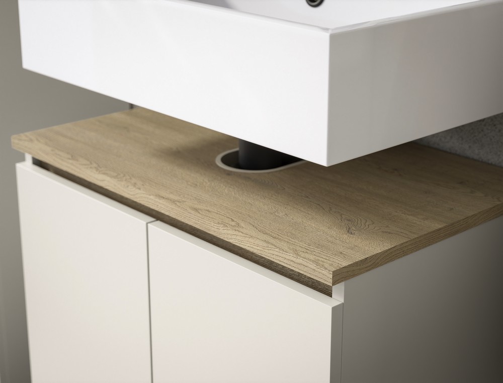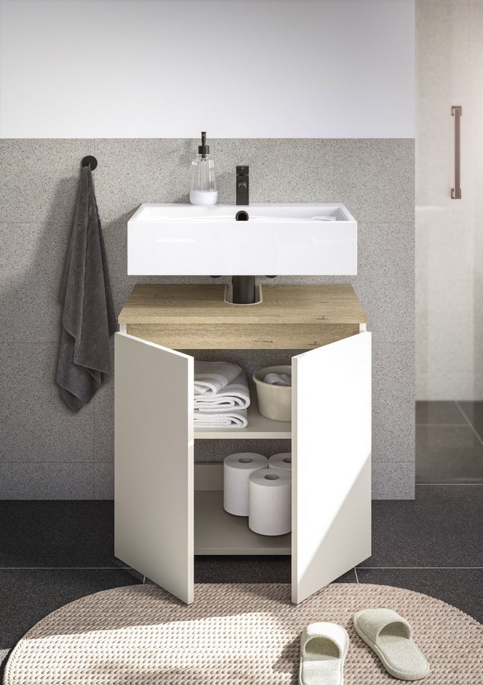 Mit seinen kompakten Maßen von ca. 60 x 60 x 38 cm (Breite x Höhe x Tiefe) passt der Schrank ideal unter Waschtische oder an freie Wandflächen im Bad. Hinter den zwei Türen findest du einen Einlegeboden, der dir flexibel nutzbaren Stauraum für Handtücher, Pflegeprodukte oder Reinigungsmittel bietet. Die grifflosen Fronten mit praktischer Griffmulde sorgen für eine klare Linienführung und eine moderne Optik.