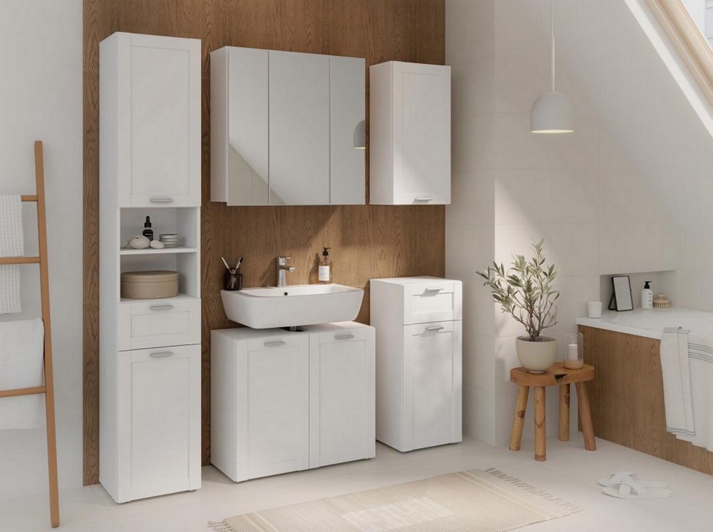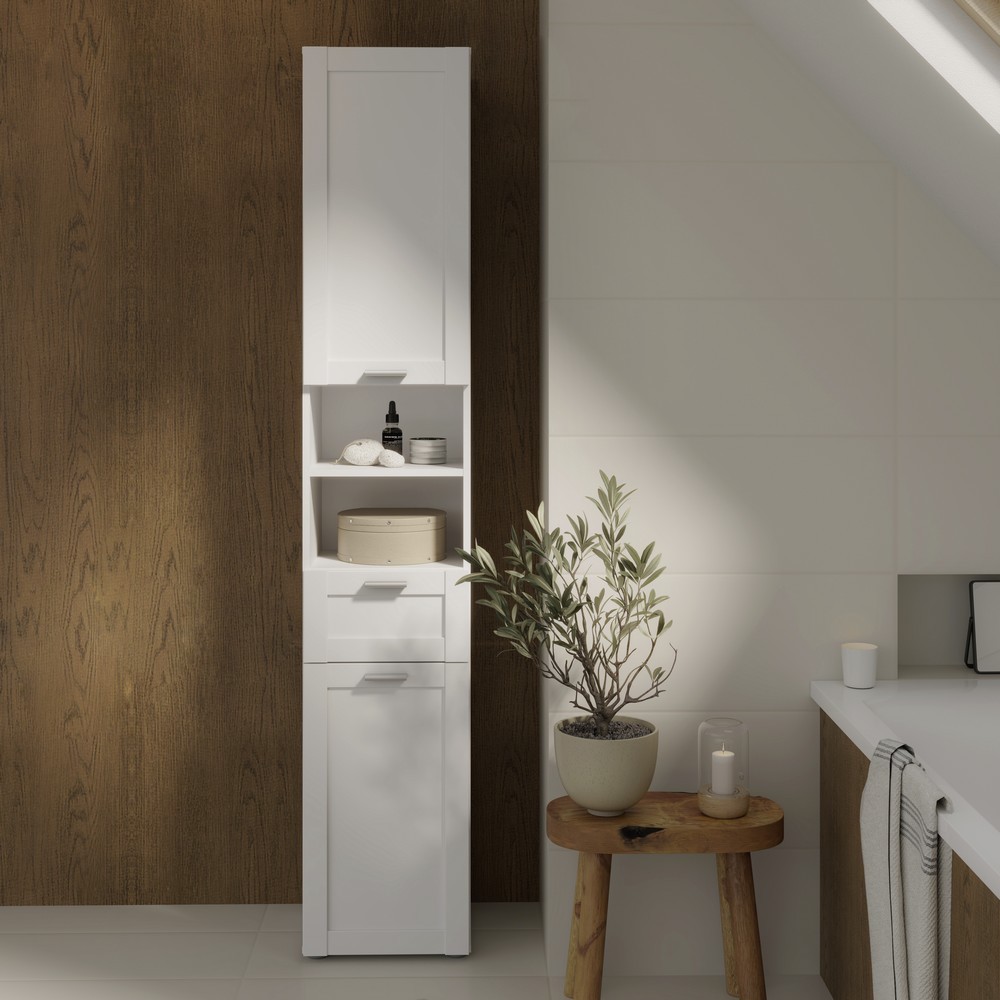 In klassischem Weiß gehalten, fügt sich der Hochschrank harmonisch in jede Badezimmereinrichtung ein und sorgt für ein helles, gepflegtes Ambiente.