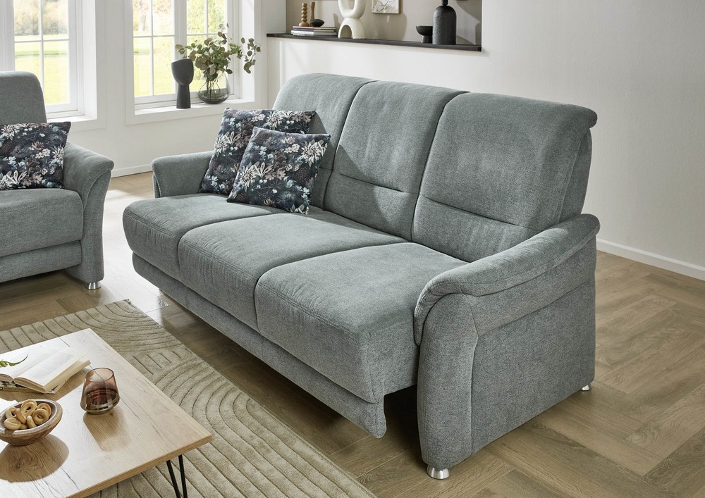 Ein Highlight ist die Vorziehbank mit Motor, die zusätzlichen Platz und Flexibilität schafft. Die Armlehnen auf beiden Seiten bieten zusätzlichen Komfort. Abgerundet wird das Design durch die eleganten Metallfüße in gebürstetem Alu.