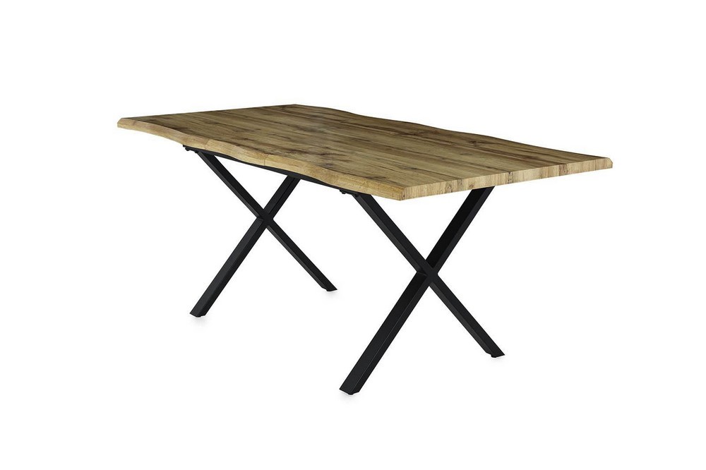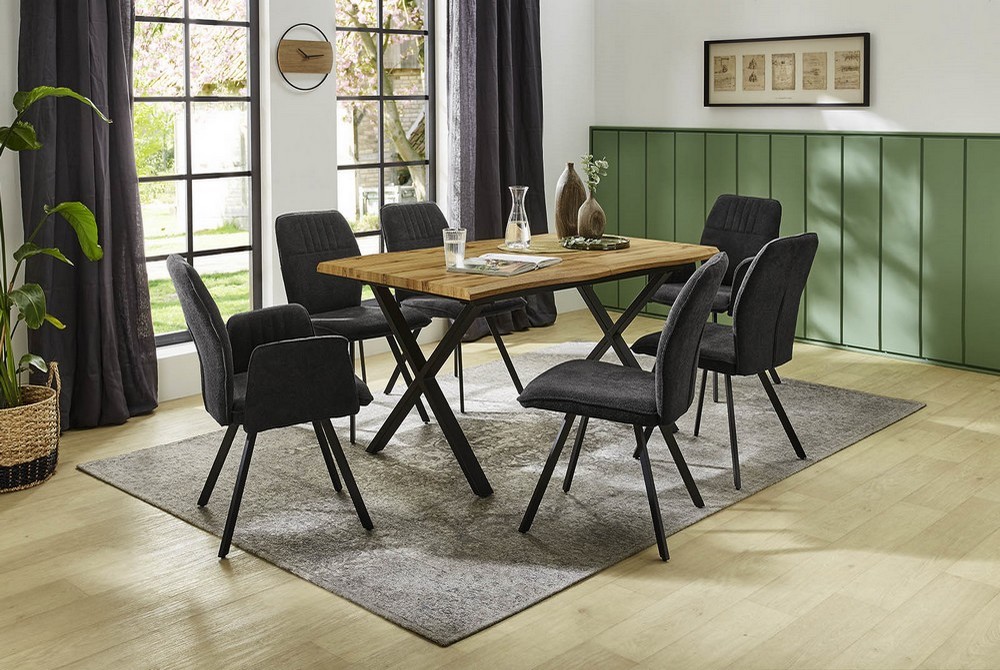 Dank des praktischen Butterflyauszugs lässt sich der Tisch mühelos von 140 cm auf 180 cm verlängern, sodass er sich flexibel an unterschiedliche Bedürfnisse anpasst. Das schwarz lackierte Metallgestell setzt einen modernen Kontrast zur Holzoptik und sorgt für eine stabile Basis.