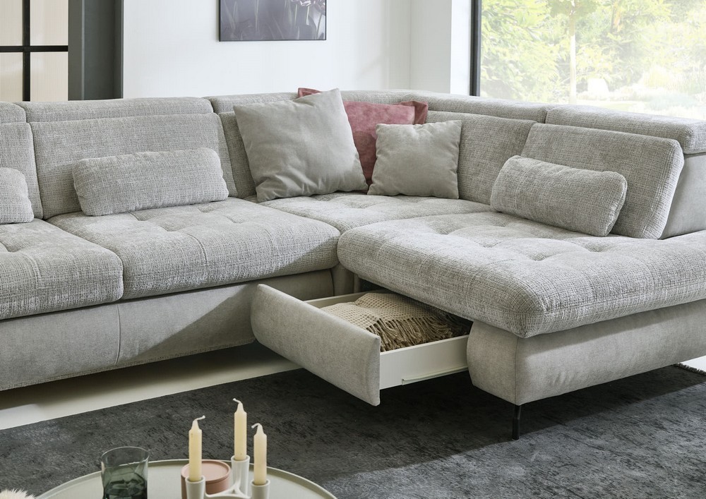 Besonders praktisch ist das 1-Sitzer Kombielement mit Anstellhocker und integriertem Schubkasten auf der linken Seite. Hier bekommst du nicht nur eine bequeme Sitzgelegenheit, sondern auch zusätzlichen Stauraum für Decken, Kissen oder andere Dinge, die du schnell zur Hand haben möchtest. Der Anstellhocker erweitert die Fläche zum Entspannen oder kann als praktische Ablage genutzt werden. Dazu kommen 3 verstellbare Kopfteile, die diesen Bereich besonders vielseitig machen.
