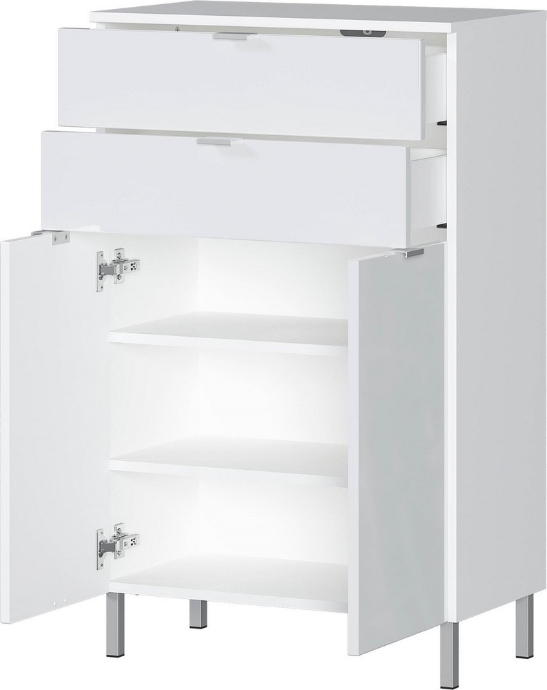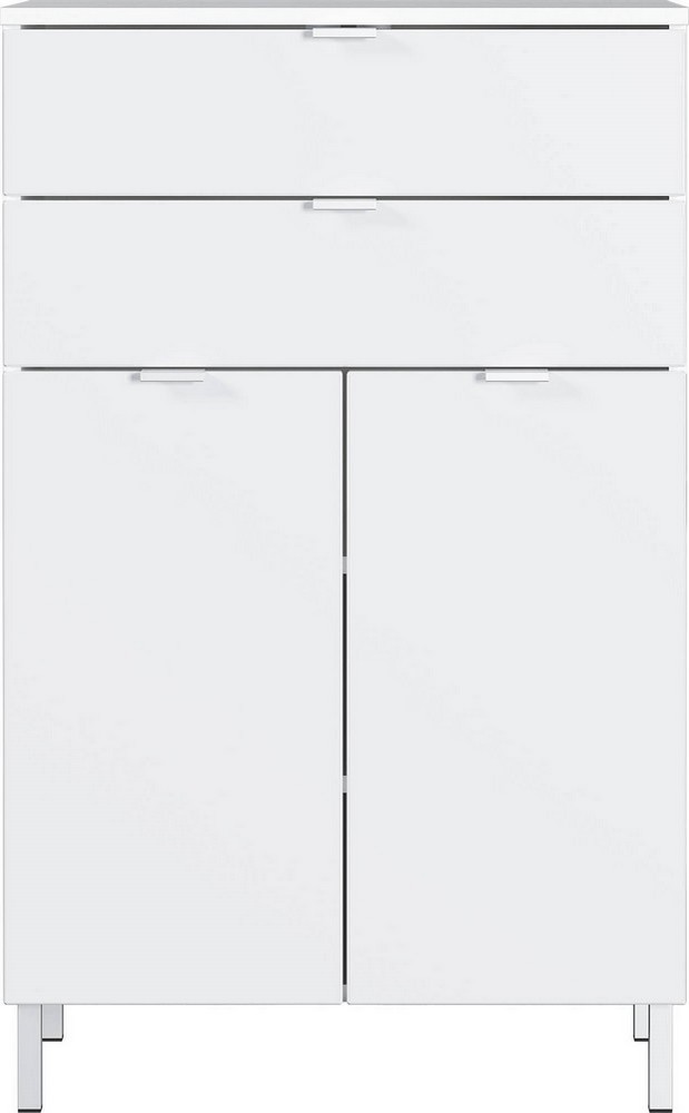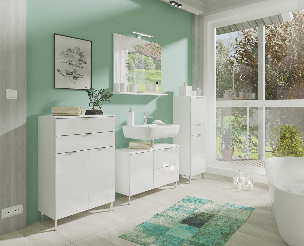 Die Kommode Marjory für dein Bad ist eine elegante und praktische Lösung, um Ordnung zu schaffen. Mit den Maßen ca. 60 x 97 x 34 cm bietet sie ausreichend Stauraum bei einer modernen Optik. Die weiße Hochglanz-Oberfläche verleiht deinem Badezimmer einen frischen, zeitlosen Look. Die Metall-Kantengriffe und die gedämpften Türen sorgen für ein hochwertiges, stilvolles Design. Der Schubkasten mit Selbsteinzug bietet zusätzlich komfortablen Stauraum. Diese Kommode fügt sich perfekt in jedes Bad und ist sowohl funktional als auch optisch ein echter Hingucker.