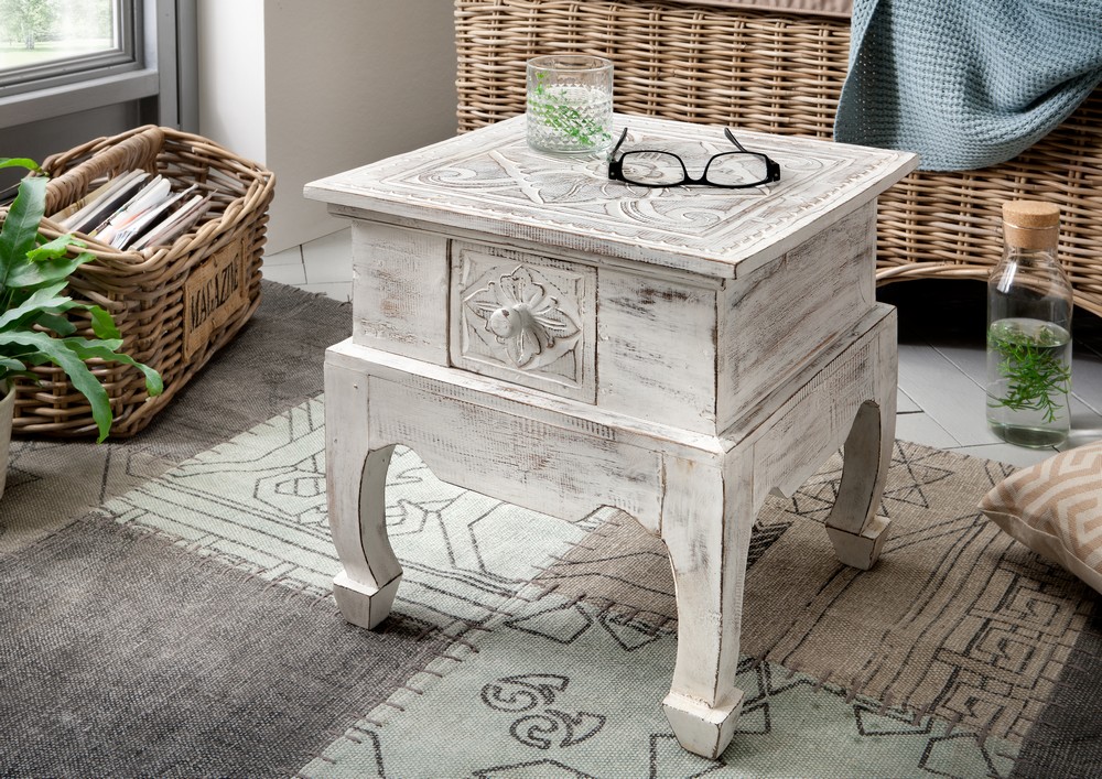 Der Beistelltisch Maroco aus recyceltem Holz in Vintage Weiß besticht durch seinen rustikalen Charme und seinen einzigartigen Shabby-Chic-Look. Die natürliche Maserung und die bewusste Vintage-Bearbeitung verleihen jedem Tisch eine individuelle Patina, die ihn zu einem stilvollen Unikat macht.