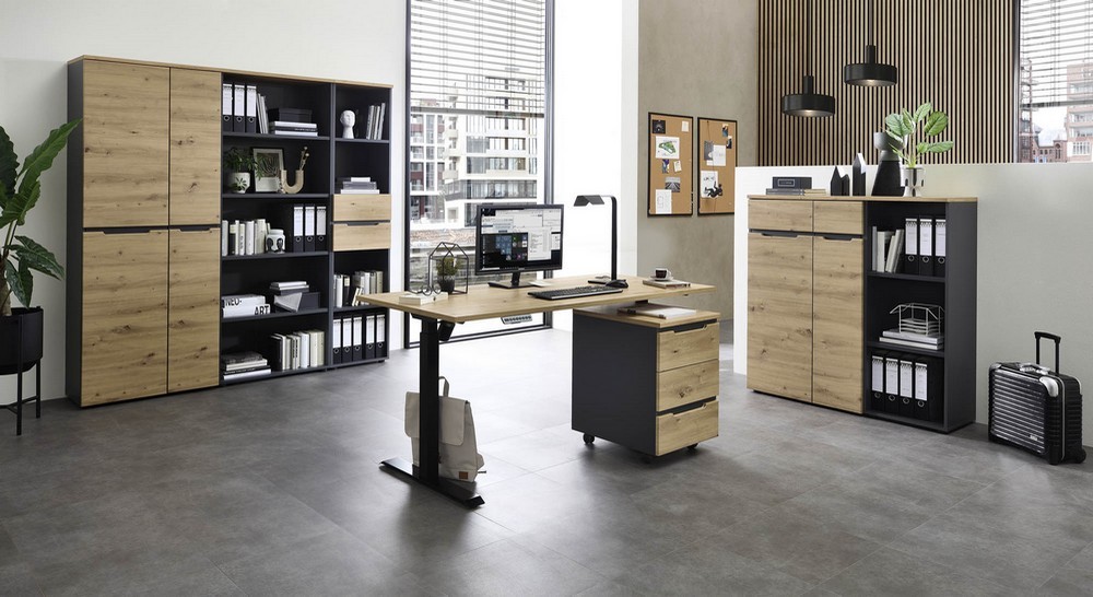 Der Korpus in Graphit sorgt für eine elegante, zeitlose Optik, während die Front in Artisan Eiche Nachbildung natürliche Akzente setzt und für eine warme, einladende Atmosphäre im Büro sorgt.