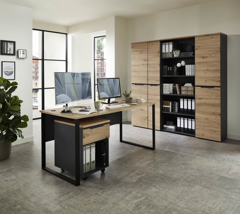 Der Korpus in Graphit verleiht dem Schrank eine elegante, zeitlose Optik, während die Front in Artisan Eiche Nachbildung für eine warme und natürliche Ausstrahlung sorgt. Diese moderne Farbkombination passt perfekt in unterschiedliche Einrichtungsstile.