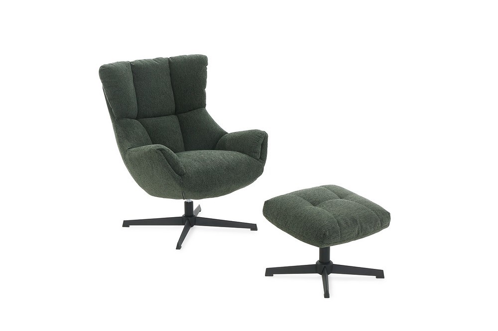 Der Relax Sessel Melania in Webstoff Grün ist die perfekte Kombination aus Komfort und Stil. Mit den Maßen von ca. 73x94x81 cm B/H/T und einem robusten Metallgestell in Schwarz bietet er nicht nur eine komfortable Sitzgelegenheit, sondern auch eine elegante Optik für jedes Zuhause. Der Bezug aus 100% Polyester und die Schaumstoffpolsterung sorgen für angenehmen Sitzkomfort. Der Sessel ist 360° drehbar, was ihm eine hohe Flexibilität verleiht. Der mitgelieferte Hocker (ca. 50x40x42 cm) bietet zusätzlichen Komfort. Die Belastbarkeit des Sessels beträgt bis zu 110 kg, mit einer Armlehnhöhe von ca. 57 cm, einer Sitzhöhe von ca. 49 cm, einer Sitzbreite von ca. 43 cm und einer Sitztiefe von ca. 52 cm. Ideal für entspannte Stunden in Ihrem Zuhause.