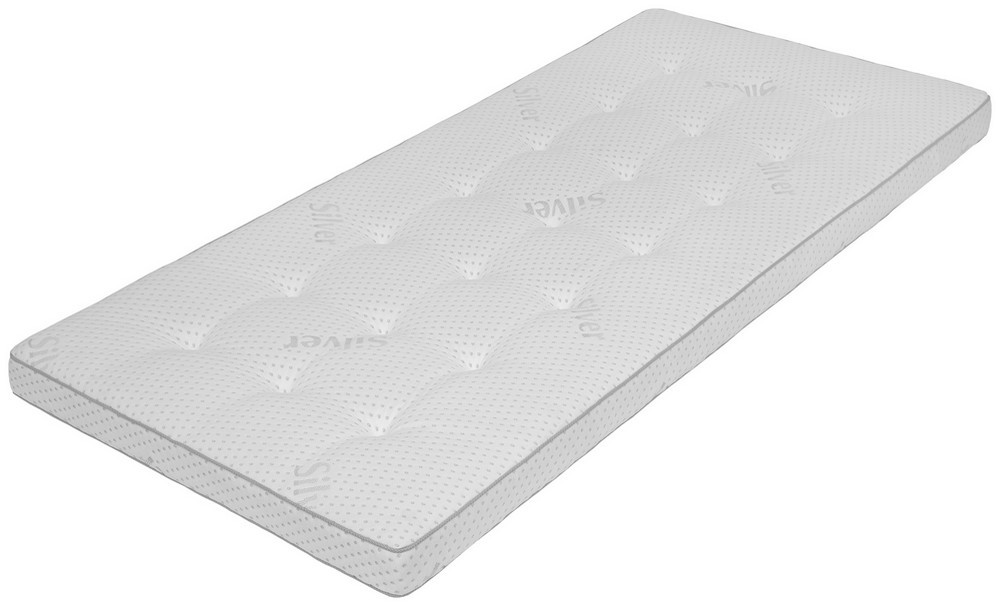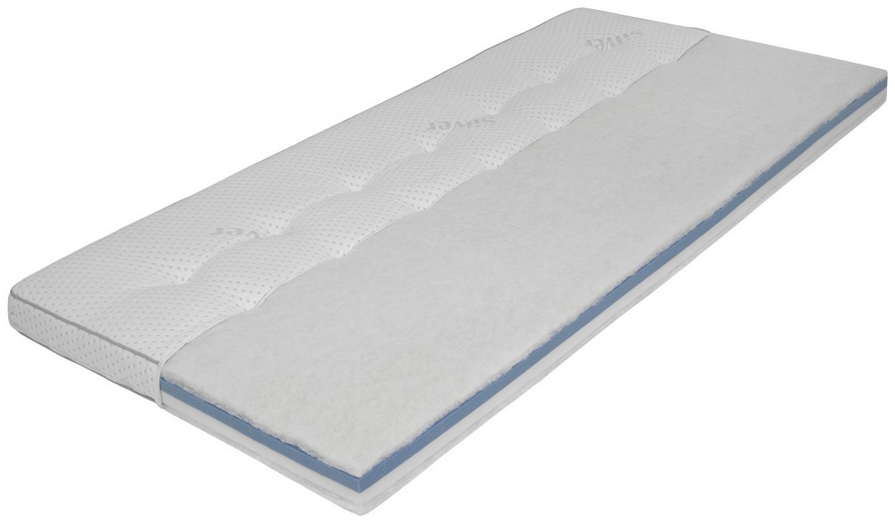 Der vierlagige Kern besteht aus 2,5 cm viskoelastischem MemoBlu-Schaum und 2,5 cm PU-Komfortschaum, beidseitig umhüllt mit einer atmungsaktiven Polyester-Klimafaser-Abdeckung. Der Bezug aus Stretch-Doppeltuch (50390-900) ist mit antibakterieller Ausrüstung versehen – ideal für ein hygienisches Schlafklima.