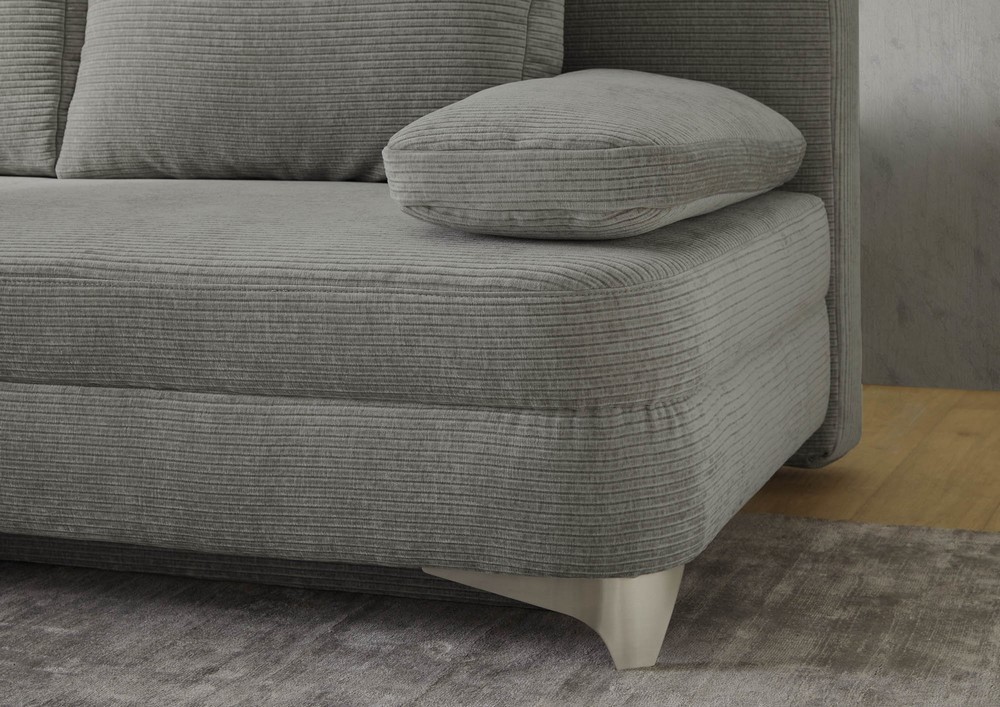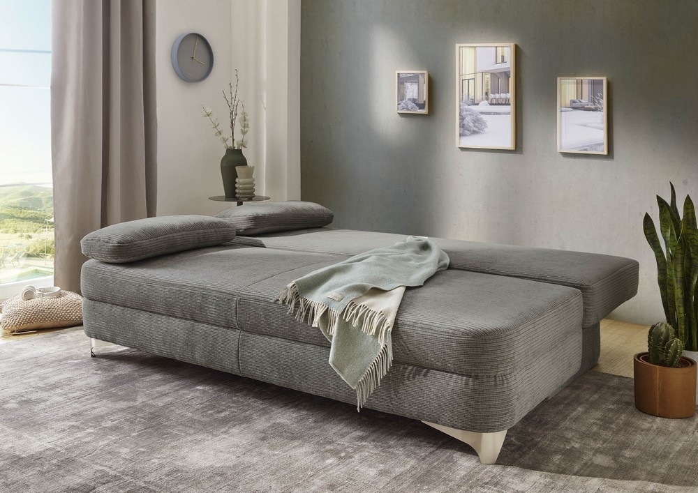 Dank praktischem Bettkasten hast du immer genug Stauraum für Decken, Kissen oder Bettwäsche. Die Sitzhöhe beträgt ca. 43 cm, die Sitztiefe lässt sich flexibel von ca. 47 bis 78 cm variieren, und mit 2 großen Rückenkissen sowie 2 bequemen Armlehnkissen ist für extra Komfort gesorgt. Die echte Rückenpolsterung erlaubt dir außerdem, das Sofa frei im Raum zu platzieren.