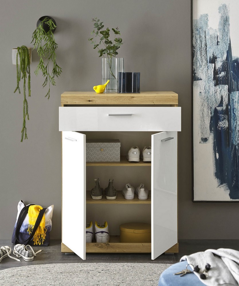 Die Schuhkommode Nobe misst ca. 80 x 91 x 38 cm (B/H/T) und kombiniert eine edle Front in Weiß Hochglanz mit einem modernen Korpus in Artisan Eiche Nachbildung. Diese Kommode überzeugt durch ihr stilvolles Design und ihre praktische Funktionalität.