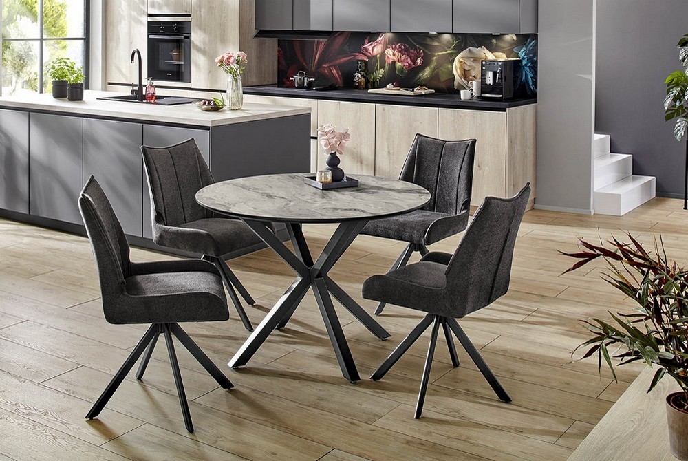 Der runde Esstisch Ocotal vereint modernes Design mit eleganter Ausstrahlung. Mit einem Durchmesser von ca. 110 cm und einer Höhe von ca. 77 cm bietet er ausreichend Platz für gesellige Runden im Ess- oder Wohnbereich. Die Tischplatte in dekorativer Marmoroptik verleiht dem Tisch einen stilvollen, edlen Look, während die ca. 2 cm starke Platte für Stabilität und hochwertige Verarbeitung steht.